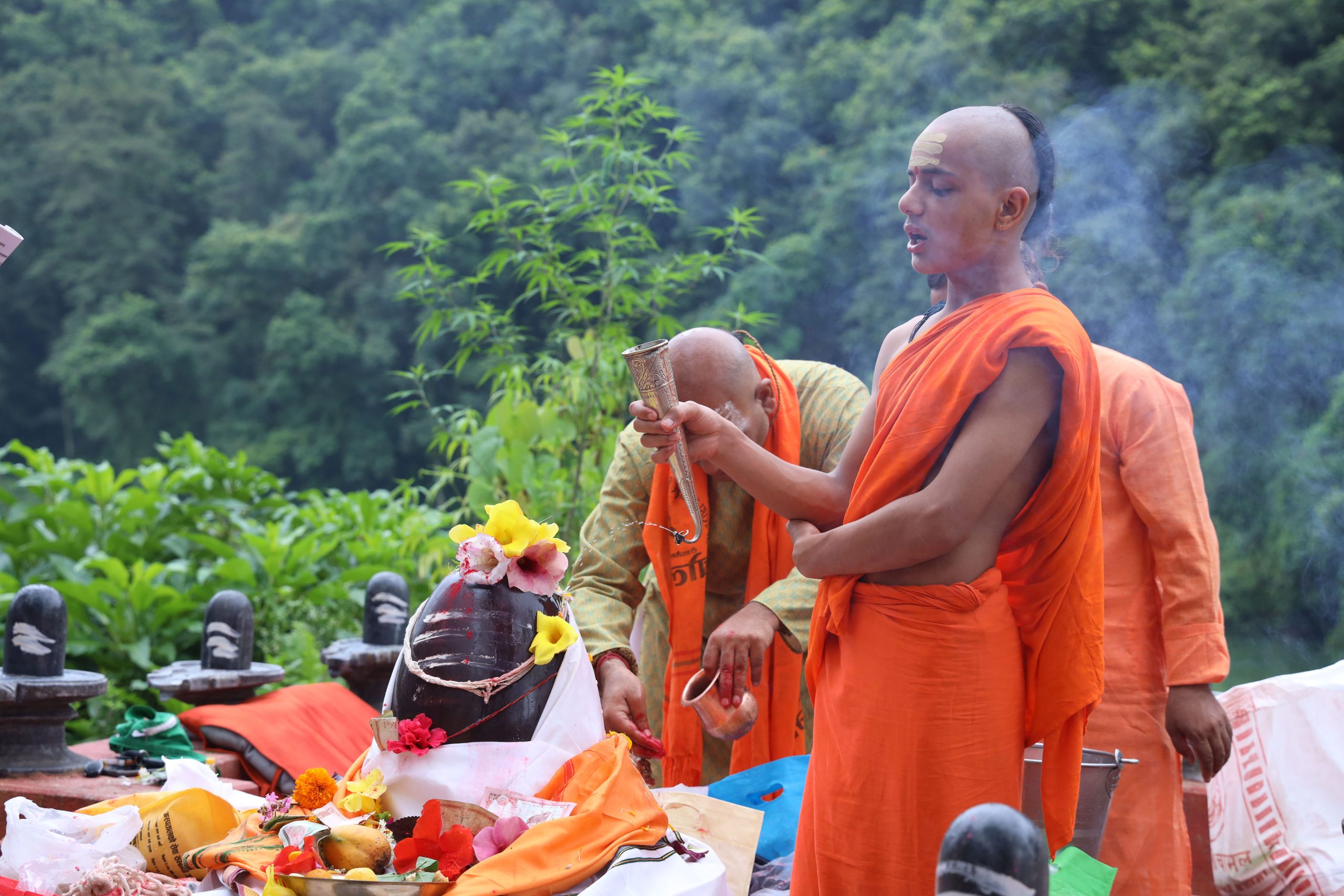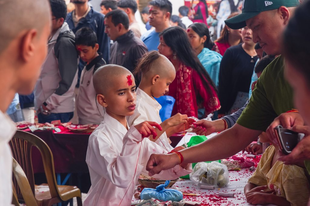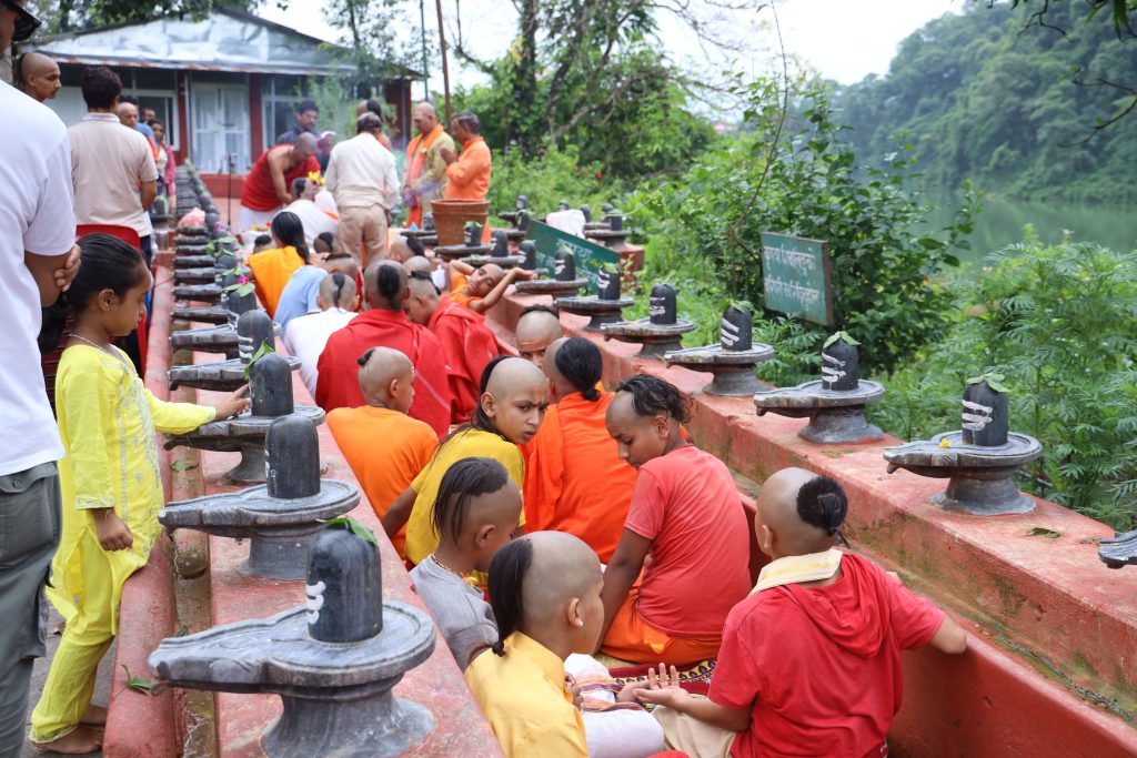 जनैपूर्णिमा र रक्षाबन्धनको अवसरमा पोखरा–२ मिरुवास्थित विन्ध्यवासिनी मन्दिरमा रक्षा सूत्र बाँध्दै ब्राह्मण। जनैपूर्णिमा जनै र राखी बाँध्दा देव, ऋषि र पितृ ऋणबाट मुक्त भई बल, बुद्धि र तेज प्राप्त हुने जनविश्वास छ। तस्बिरः युनिश गुरुङ/रासस