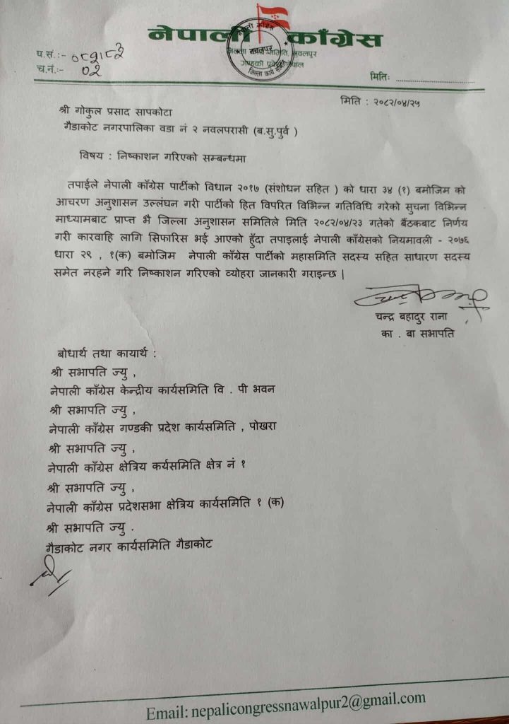 यो कारबाहीको पत्र नेपाली कांग्रेसको केन्द्रीय कार्यसमितिदेखि गैंडाकोट नगर कार्यसमितिसम्मलाई बोधार्थ दिइएको छ, जसले पार्टीले यस घटनालाई गम्भीर रूपमा लिएको देखाउँछ। सापकोटाको बहिर्गमन र कांग्रेसको तत्काल कारबाहीले गैंडाकोटको स्थानीय राजनीतिमा नयाँ ध्रुवीकरण सिर्जना गरेको छ।