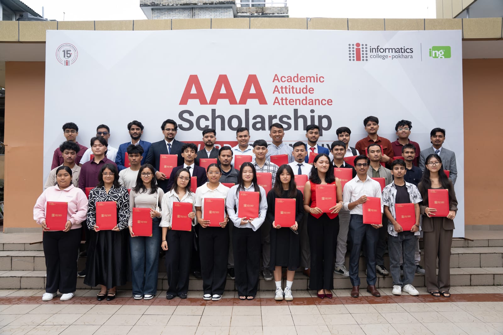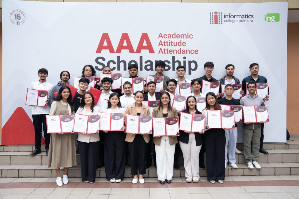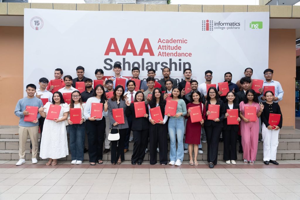 पोखरा । इन्फर्मेटिक्स कलेज पोखराले आफ्ना १ सय २७ जना विद्यार्थीलाई २ करोड १० लाख रुपैयाँ बराबरको ‘ट्रिपल ए’ छात्रवृत्ति प्रदान गरेको छ । ‘ट्रिपल ए’ छात्रवृत्ति अन्तर्गत विद्यार्थीको शैक्षिक उत्कृष्टता (एकेडेमिक), दृष्टिकोण (एटिच्युड) र उपस्थिति (एटेन्डेन्स) लाई आधार मानेर छनोट गरिन्छ ।