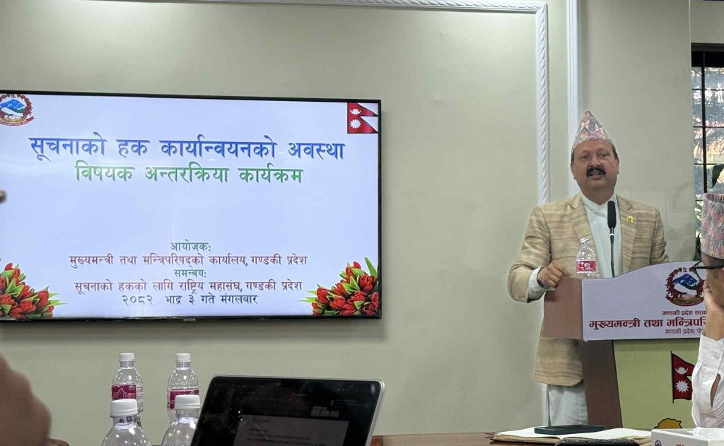गण्डकी प्रदेशमा सूचनाको हक कार्यान्वयन सरकारी प्रतिबद्धतामा मात्रै सीमित भएको भन्दै अधिकारकर्मीहरूले सरकारको कार्यशैली सुधार गर्न सुझाव दिएका छन् । राष्ट्रिय सूचना दिवसको अवसरमा मंगलबार पोखरामा आयोजित अन्तरक्रियामा उनीहरूले कानुन बनेको वर्षौं बित्दा पनि नियमावली नबनाउने र वेबसाइटसमेत अद्यावधिक नगर्ने प्रवृत्तिले नागरिकले सूचना पाउन सास्ती खेप्नुपरेको बताए ।