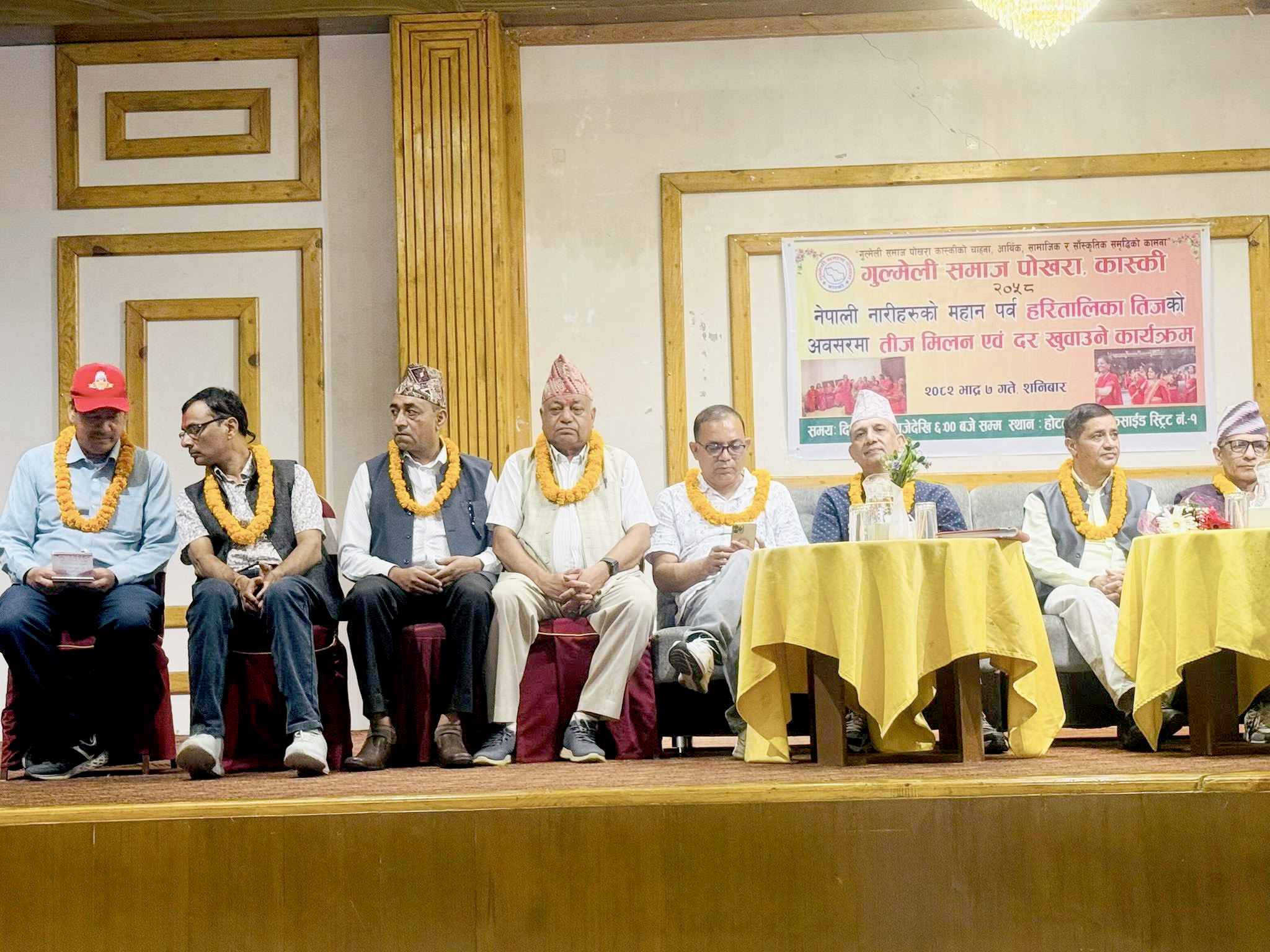 पोखरा । गुल्मेली समाज पोखरा कास्कीले शनिबार तीज मिलन विशेष कार्यक्रम गरेको छ । ‘गुल्मेली समाज पोखरा कास्कीको चाहना, आर्थिक, सामाजिक र साँस्कृतिक समृद्धिको कामना’ भन्ने नाराका साथ भएको कार्यक्रममा सहभागी महिलाले गुल्मीको मौलिक तीजगीत प्रस्तुत गर्नुका साथै आजीवन सदस्यलाई प्रमाणपत्र वितरण गरिएको छ ।