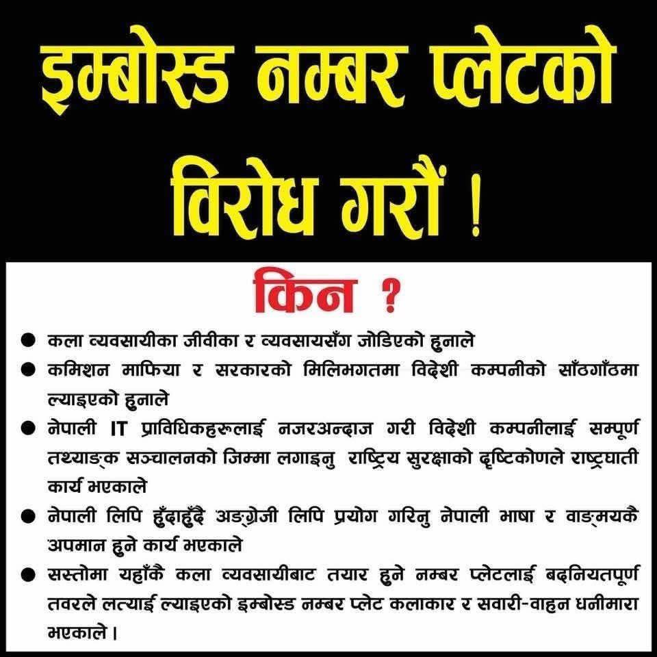 सरकारले आगामी २०८२ भदौदेखि इम्बोस्ड नम्बर प्लेट अनिवार्य गर्ने निर्णय सार्वजनिक गरेसँगै यातायात व्यवसायीहरूले यसको विरोध सुरु गरेका हुन् । यसै क्रममा, पृथ्वी राजमार्ग बस सञ्चालक कम्पनी प्रालिका अध्यक्ष योगेन्द्र केसीले सामाजिक सञ्जाल फेसबुकमार्फत एक आह्वान जारी गर्दै सबै व्यवसायीलाई यो निर्णयको विरोधमा एकजुट हुन आग्रह गरेका छन् ।