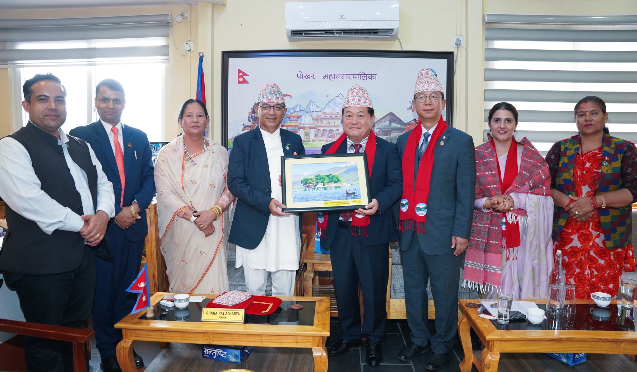 पोखरा । विश्व शौचालय सङ्घका महासचिवको नेतृत्वमा आएको कोरियाली प्रतिनिधिमण्डलले पोखरा महानगरपालिकाका प्रमुख धनराज आचार्यसँग भेट गरेको छ । भेटमा सङ्घका महासचिव वन होङ लीले पोखरा महानगर क्षेत्रमा अत्याधुनिक प्रविधियुक्त सार्वजनिक शौचालय निर्माणका लागि सहकार्यको प्रस्ताव गरेका छन् ।
