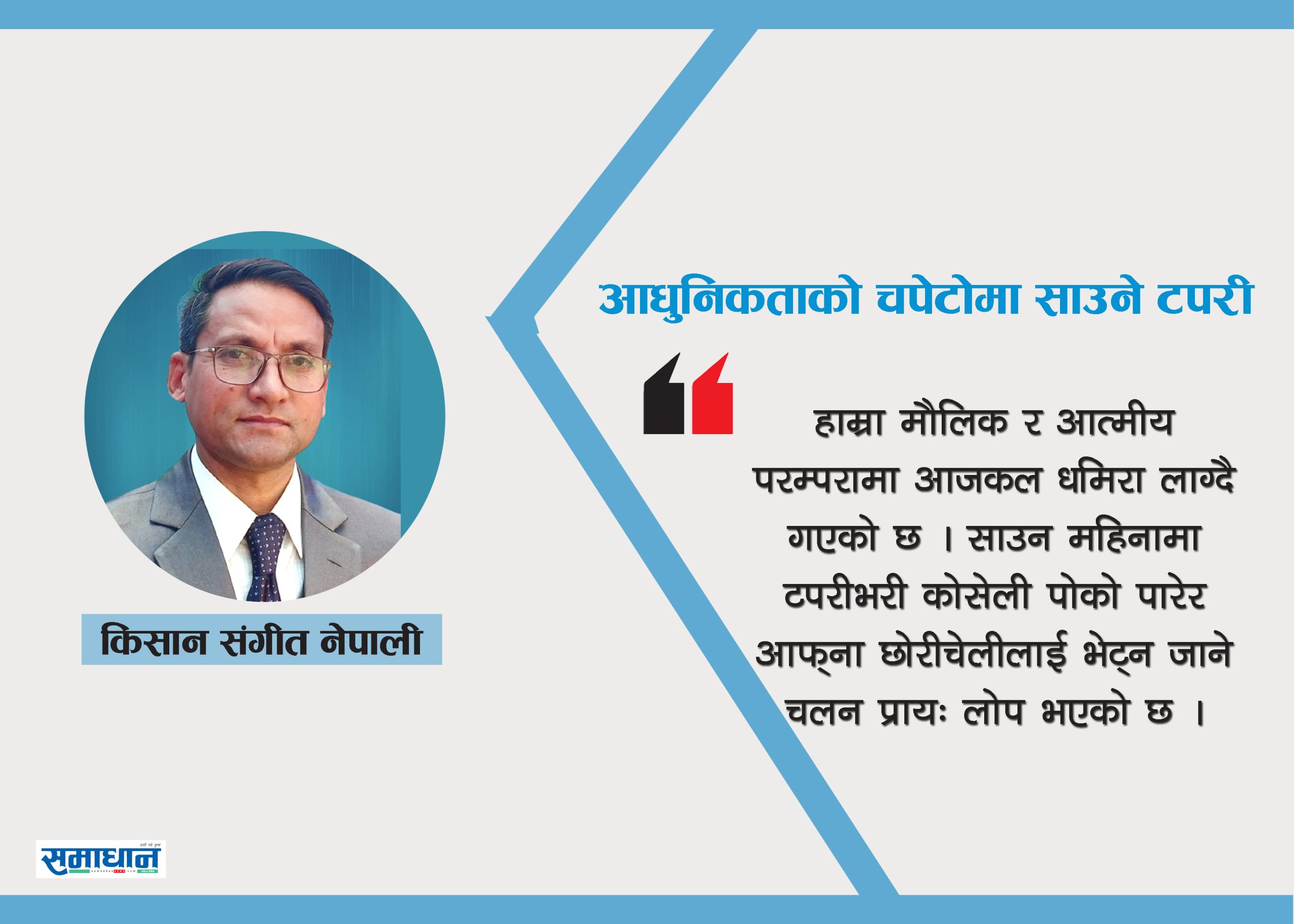 यति मौलिक र आत्मीय परम्परामा आज धमिरा लाग्दैछ । छिमेकी र विदेशी मुलुकका आयातित संस्कृतिलाई सहर्ष स्वीकार्दै अघि बढेको नेपाली समाजले आज आफ्ना मौलिक परम्पराको बेवास्ता गरिरहेको छ । साउने टपरी एउटा सानो सवाल मात्र हुन सक्छ, तर समाजका नयाँ पात्रहरूमा जुन प्रवृत्ति हाबी हुँदैछ, त्यसले हाम्रो मौलिकतालाई क्रमशः मास्दै लैजाने निश्चित छ । विश्वका विभिन्न देशमा छरिएर रहेका नेपाली डायस्पोराले आफ्ना चाडपर्व र संस्कृतिलाई स्थापित गर्न गरिरहेको अभ्यासले हाम्रा परम्परा कति महत्त्वपूर्ण रहेछन् भन्ने देखाउँछ । नेपाल र नेपालीलाई विश्वको जुनसुकै कुनामा चिनाउने अमूल्य निधि भनेकै हाम्रा संस्कृति र परम्परा हुन् भन्ने चेतना डायस्पोरामा विकास भएको छ ।