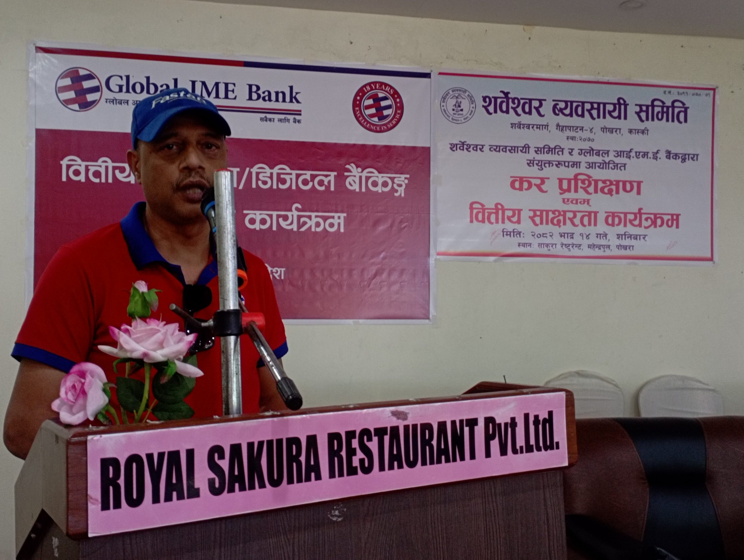 पोखरा । पोखराको चिप्लेढुंगा स्थित सर्वेश्वर व्यवसायी समिति र पराजुली मार्गका व्यवसायीलाई शनिबार कर तथा वित्तीय साक्षरता अभिमुखीकरण दिइएको छ । पोखराको चिप्लेढुंगादेखि गैह्रापाटनसम्म फैलिएको सर्वेश्वर मार्ग र पराजुली मार्गका होलसेल व्यवसायीको साझा संस्था सर्वेश्वर व्यवसायी समितिले कर कार्यालय पोखरा र ग्लोबल आईएमई बैंकसँगको सहकार्यमा कार्यक्रम गरेको हो ।