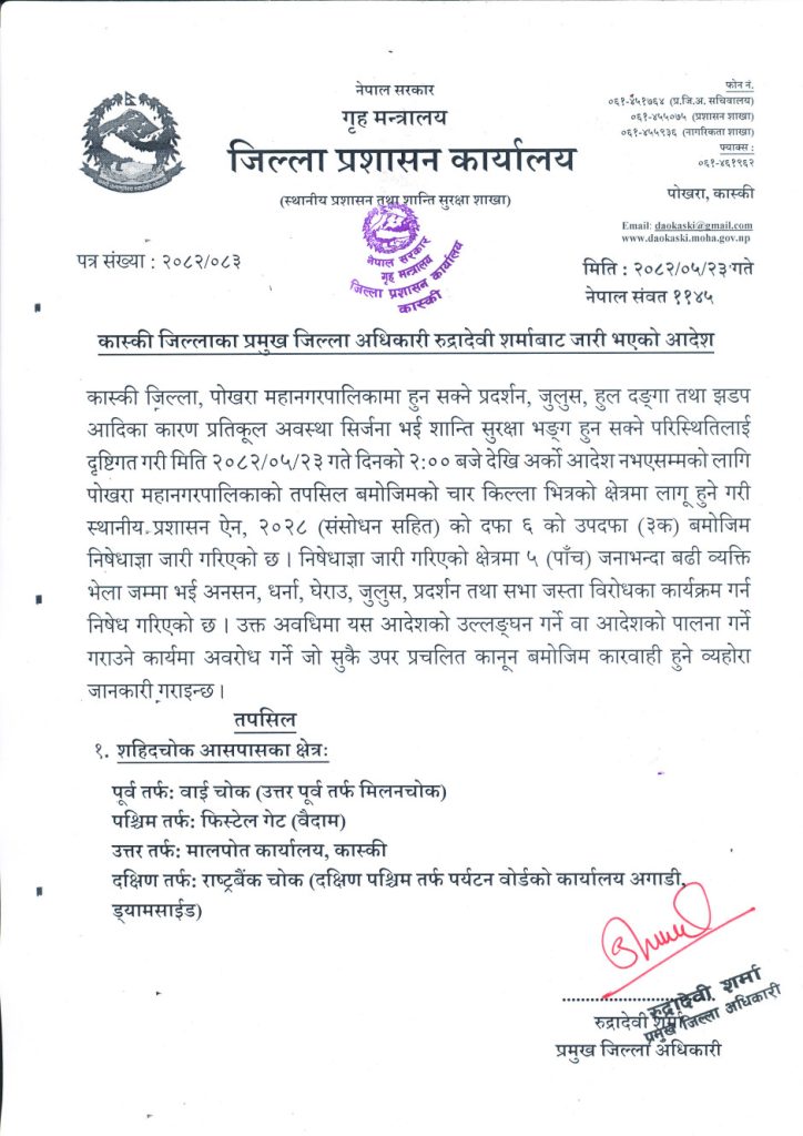 प्रमुख जिल्ला अधिकारी रुद्रदेवी शर्माद्वारा हस्ताक्षरित सूचनाअनुसार, २०८२ असार २३ गते दिउँसो २ बजेदेखि लागु हुने गरी स्थानीय प्रशासन ऐन, २०२८ (संशोधन सहित) को दफा ६ को उपदफा (एक) बमोजिम निषेधाज्ञा जारी गरिएको हो।