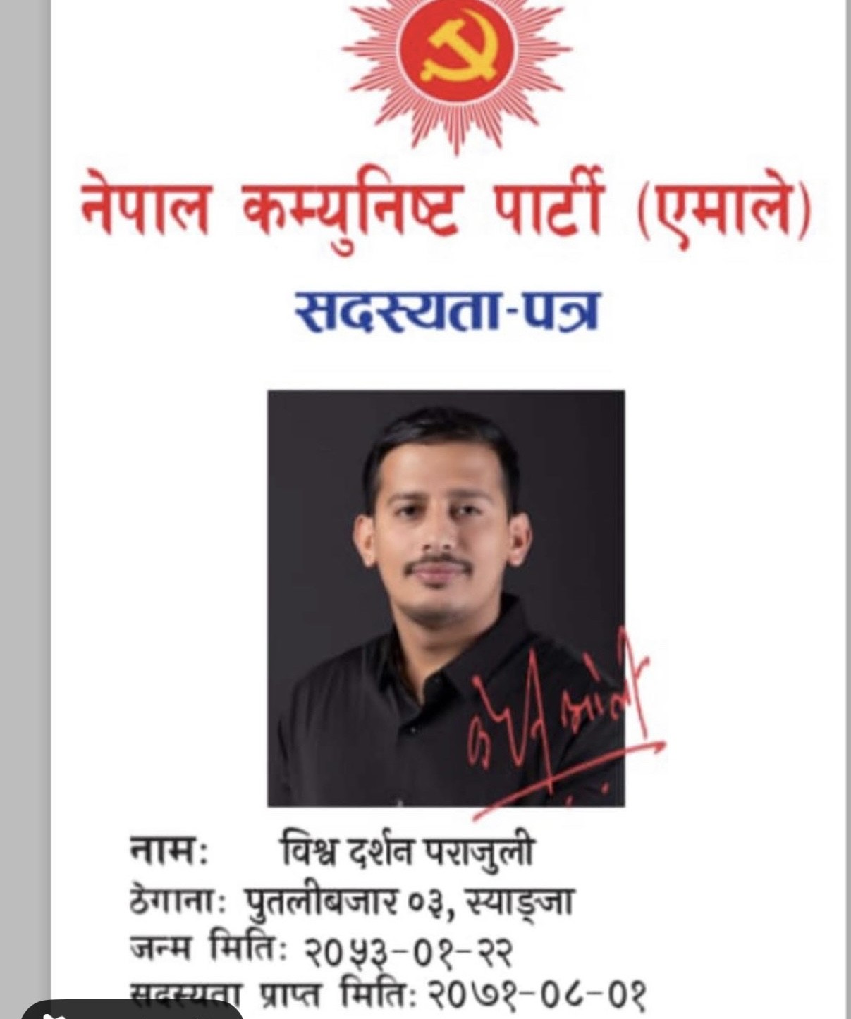 पोखरा । युवा नेता विश्वदर्शन पराजुलीले नेकपा (एमाले) को साधारण सदस्यता र पार्टीका सबै सांगठनिक जिम्मेवारीबाट राजीनामा दिएको घोषणा गरेका छन्। उनले सामाजिक सञ्जाल फेसबुकमार्फत ‘यतिबेला पारिवारिक दुःखमा सुनवलमा छु’ भन्दै आफ्नो राजनीतिक यात्राको अन्त्य र पार्टी परित्यागको जानकारी गराएका हुन्।