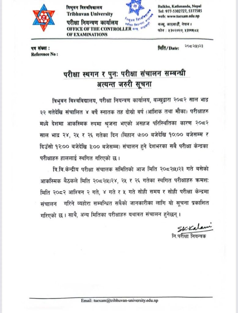देशैभरका परीक्षा केन्द्रमा २४, २५ र २६ भदौमा सञ्चालन हुने भनिएको परीक्षा स्थगित गरिएको सूचनामा उल्लेख छ।