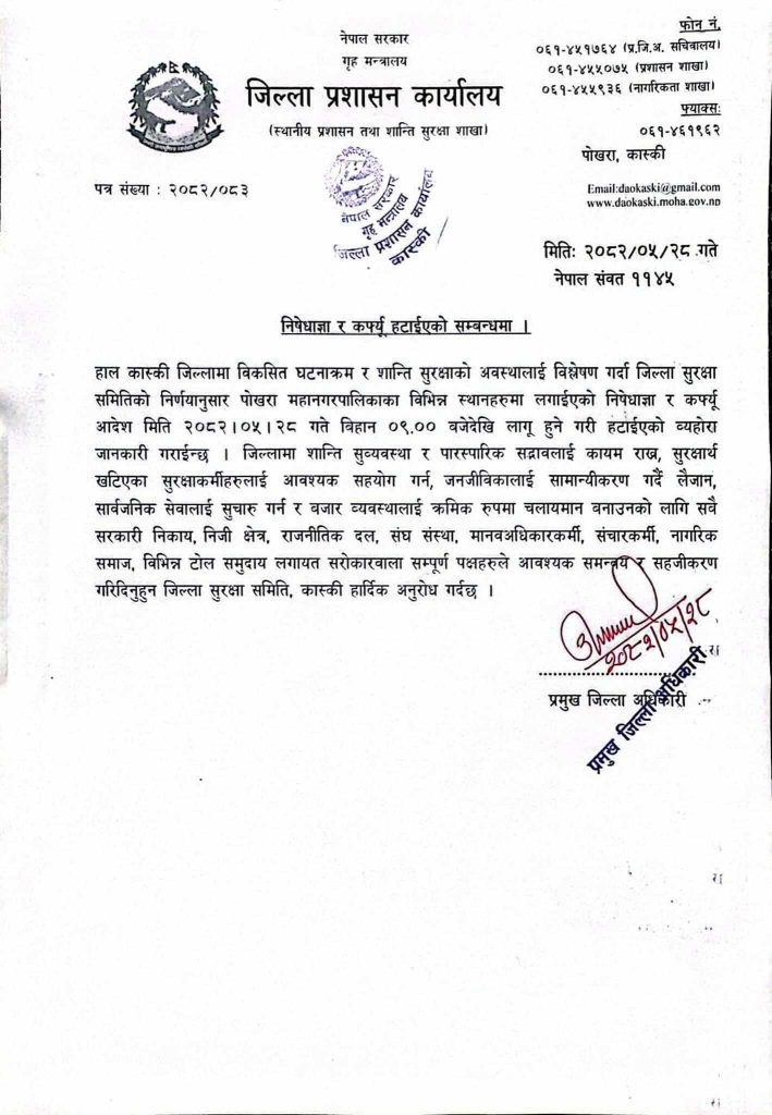 जिल्ला प्रशासन कार्यालय कास्कीले एक सूचना जारी गर्दै यसअघि लगाइएको कर्फ्यू आदेश हटाइएको जानकारी गराएको हो। प्रमुख जिल्ला अधिकारी रुद्रादेवी शर्माद्वारा हस्ताक्षरित सूचनामा जिल्लामा शान्ति सुव्यवस्था र पारस्परिक सद्भाव कायम राख्न, सुरक्षाका लागि आवश्यक सहयोग गर्न, जनजीविकालाई सामान्यीकरण गर्दै लैजान, सार्वजनिक सेवालाई सुचारु गर्न र बजार व्यवस्थालाई क्रमिक रूपमा चलायमान बनाउन अनुरोध गरिएको छ।