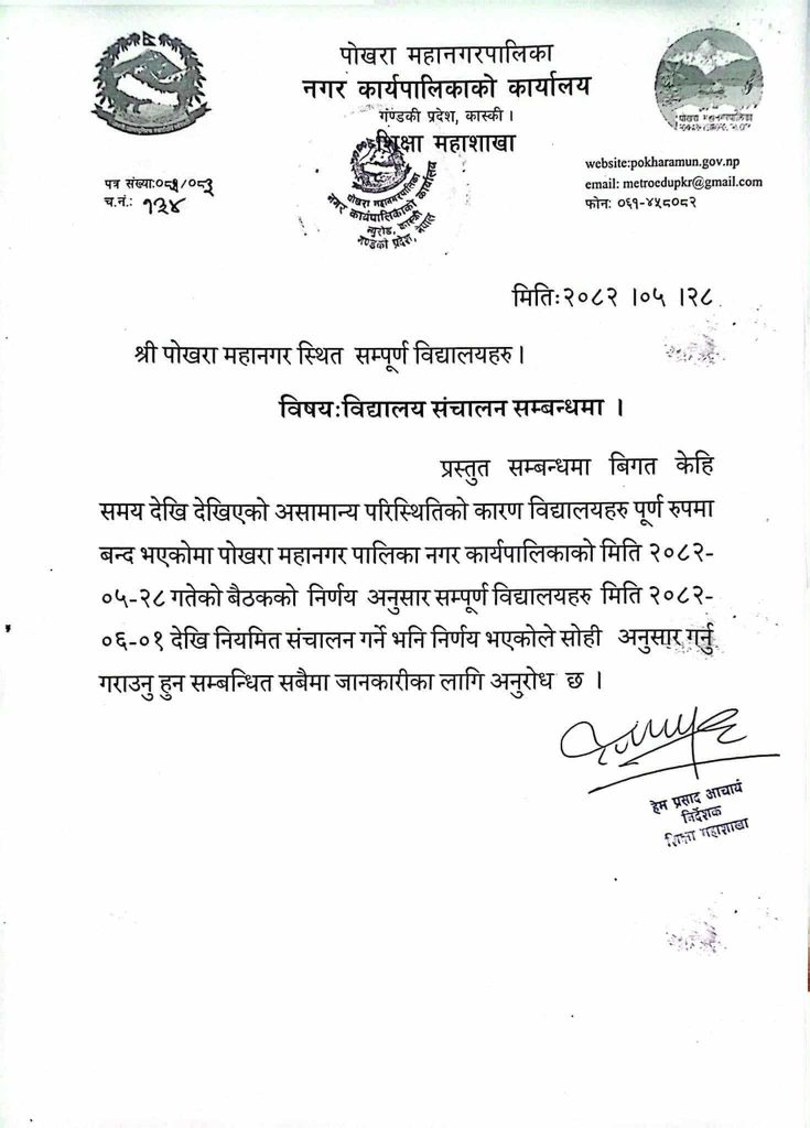 असामान्य परिस्थितिका कारण बन्द रहेका पोखरा महानगरपालिकाभित्रका सबै विद्यालय असोज १ गतेदेखि नियमित सञ्चालनमा आउने भएका छन् । पोखरा महानगरपालिका, नगर कार्यपालिकाको भदौ २८ गते बसेको बैठकले असोज १ गतेदेखि नियमित रुपमा विद्यालय सञ्चालन गर्ने निर्णय गरेको शिक्षा महाशाखाले जनाएको छ ।
