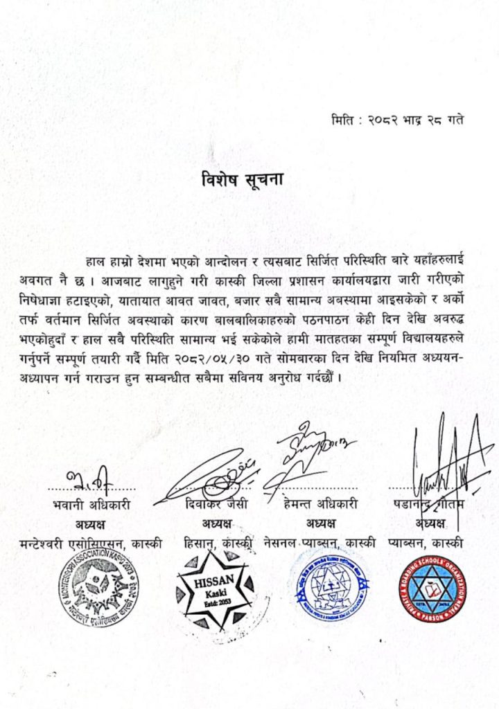 जेन जी आन्दोलनका कारण कास्कीसहित देशभरका विद्यालयमा पढाइ ठप्प छ । जिल्ला प्रशासन कार्यालय कास्की द्वारा जारी गरीएको निषेधाज्ञा हटाइएको, यातायात आवत जावत, बजार सबै सामान्य अबस्थामा आइसकेकाले सोमबारबाट पढाइ थाल्ने निर्णय गरिएको प्याब्सन अध्यक्ष षढानन्द गौतमले जानकारी दिए ।