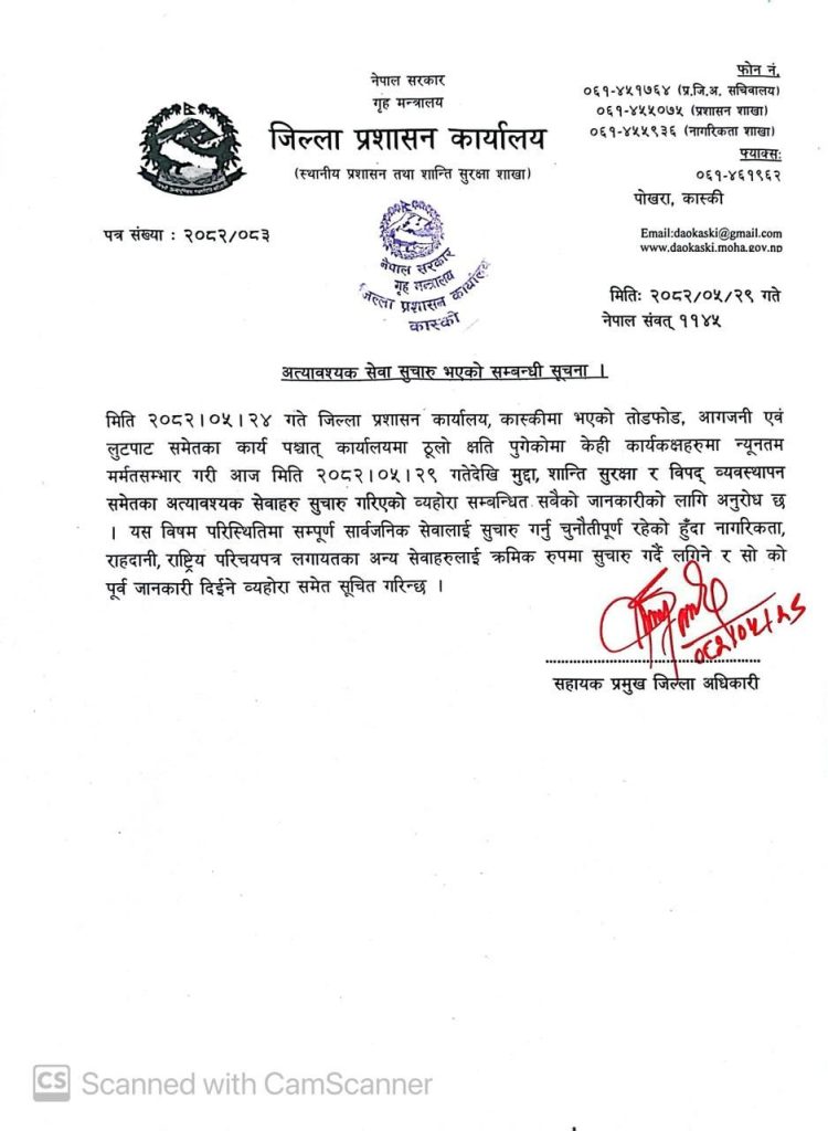 जिल्ला प्रशासन कार्यालय कास्कीमा सामान्य सरसफाइ र मर्मतसम्भारपछि आजदेखि कार्यालयका केही अत्यावश्यक सेवा फेरि सुरु गरिएको छ २४ भदौमा भएको तोडफोड, आगजनी र लुटपाटका कारण ठूलो क्षति पुगेको थियो ।