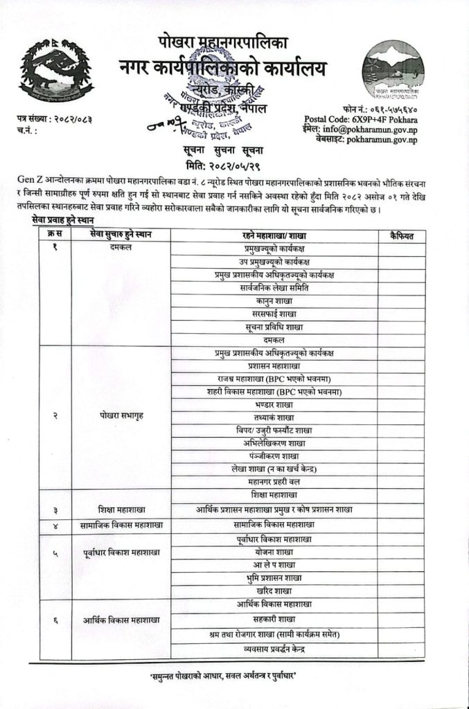 पोखरा । पोखरा महानगरपालिकाले वैकल्पिक व्यवस्था गरी सेवा प्रवाह गर्ने भएको छ ।न–जी आन्दोलनका क्रममा पोखरा महानगरपालिकाको मुख्य प्रशासकीय भवनमा गरिएको आगजनीका कारण कार्यालय पूर्ण रूपमा क्षतिग्रस्त भएको छ । आन्दोलनकारीहरूले भवनका अधिकांश कोठामा आगो लगाउँदा महत्त्वपूर्ण कागजातदेखि कार्यालयका सामग्री खरानी भएका छन् भने प्रमुख प्रशासकीय अधिकृतको कार्यकक्षमा समेत तोडफोड गरिएको छ । साथै कार्यालयका केही सामग्री चोरी भएको महानगरले जनाएको छ ।