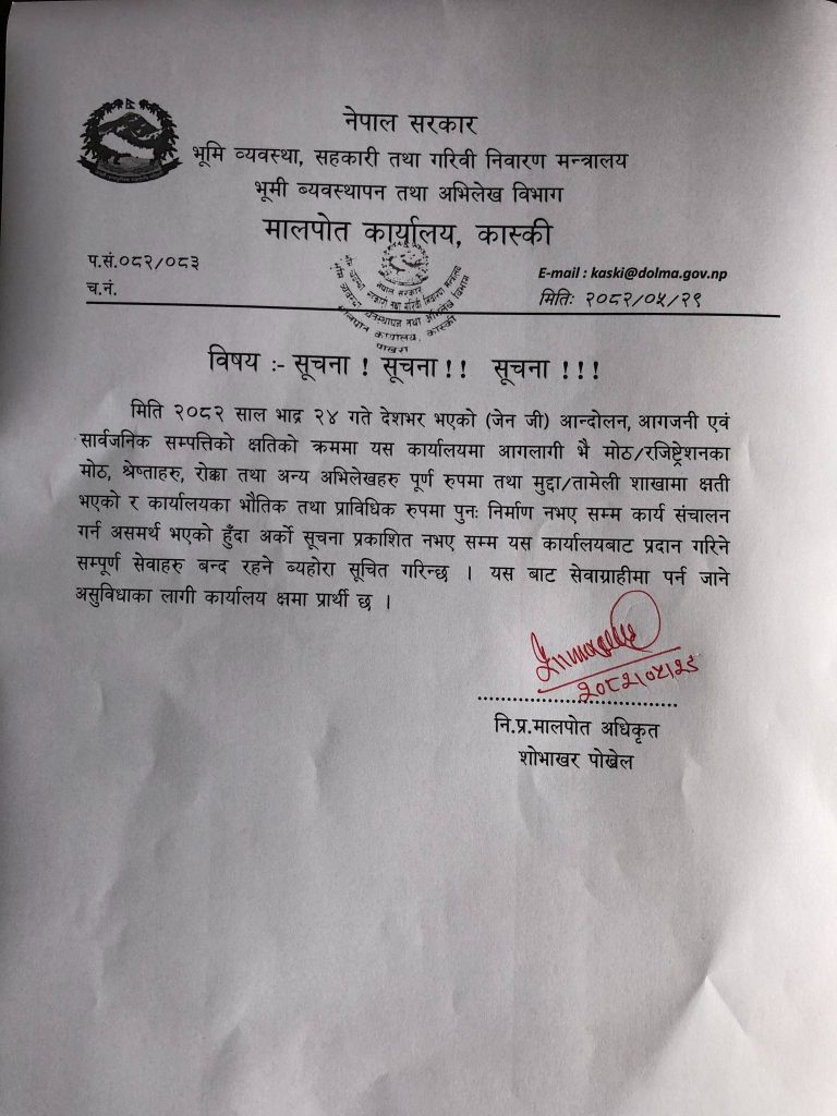 कार्यालयले सूचना जारी गर्दै २४ भदौमा आन्दोलनका क्रममा भएको तोडफोड र आगजनीका कारण मोटर, कम्प्युटर, रोखा, फोटोकपी मेसिनसहितका उपकरणमा क्षति पुगेकाले सम्पूर्ण सेवा रोकिएको जनाएको छ।