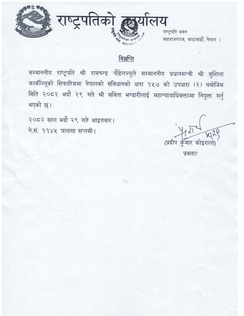 प्रधानमन्त्री कार्कीको सिफारिसमा सविता भण्डारी महान्यायाधिवक्ता ९२ वर्षीय वरिष्ठ अधिवक्ता कृष्णप्रसाद भण्डारीकी छोरी सबिता यसअघिका महान्यायाधिवक्ता केशव बडालको राजीनामापछि सिफारिस भएकी हुन्। राष्ट्रपति रामचन्द्र पौडेलले बडालको राजीनामा स्वीकृत गरिसकेका छन्।