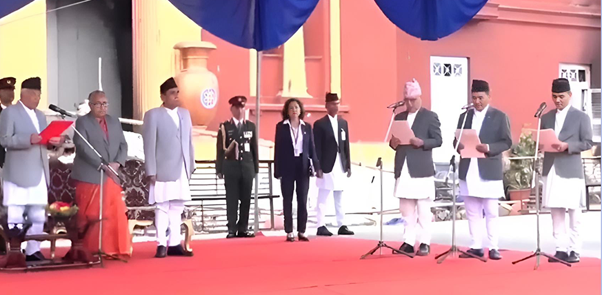 राष्ट्रपति कार्यालयको खण्डहर भवन बाहिर नवनियुक्त तीन मन्त्रीहरुले सोमबार शपथ लिएका छन् । प्रधानमन्त्री सुशीला कार्कीको उपस्थितीमा राष्ट्रपति रामचन्द्र पौडेलबाट शपथ लिएका हुन् ।