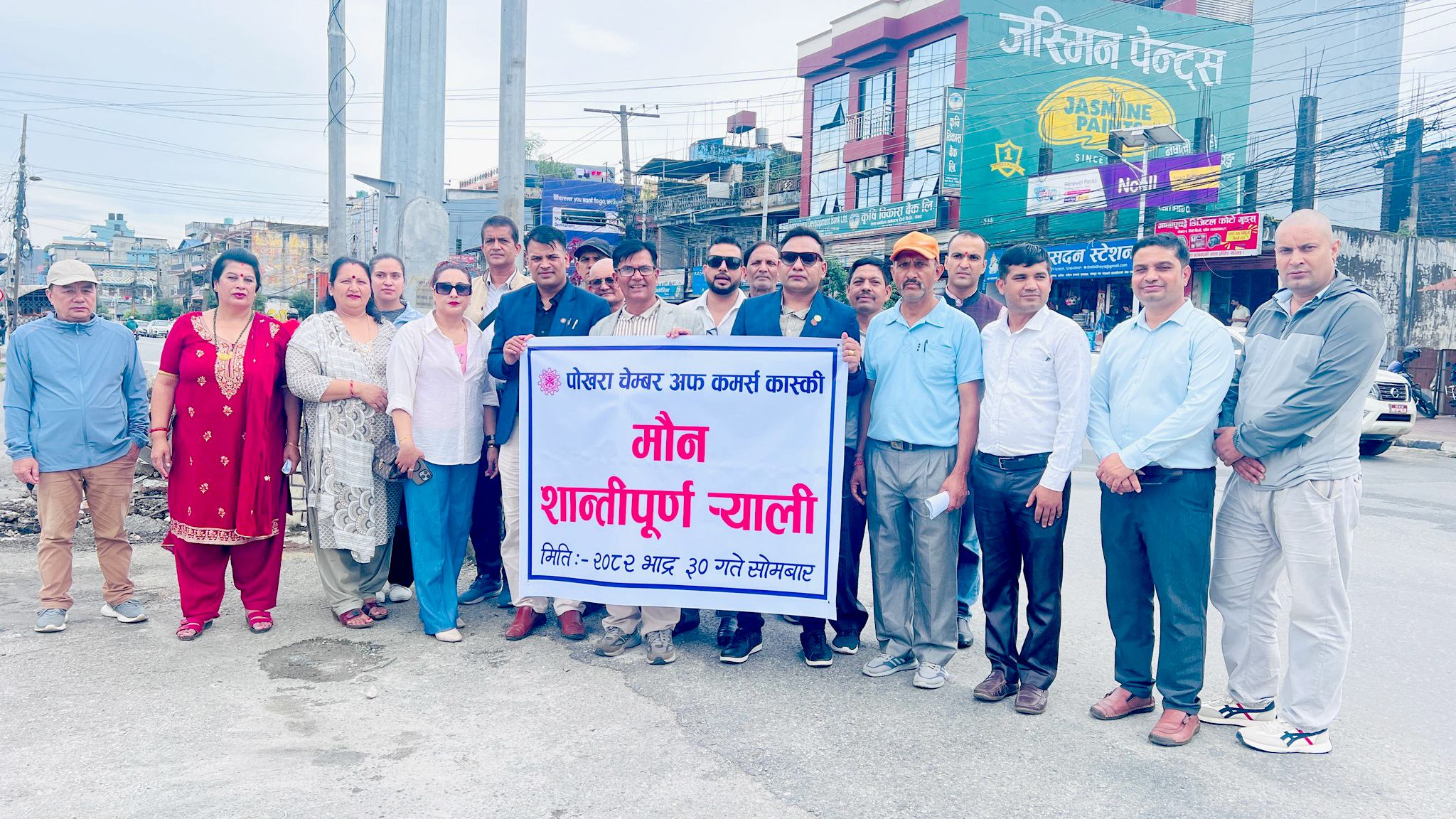 उद्योगी, व्यवसायीका लागि शान्ति र सुरक्षाको वातावरण निर्माण गर्न माग राख्दै पोखरा चेम्बर अफ कमर्स कास्कीले सोमबार शान्तिपूर्ण मौन र्याली निकालेको छ । पोखरा ५ पस्र्याङ स्थित चेम्बरको सचिवालयबाट सुरु भएको र्याली मालेपाटन हुँदै रोकिमीमा पुगेर समापन भएको थियो ।