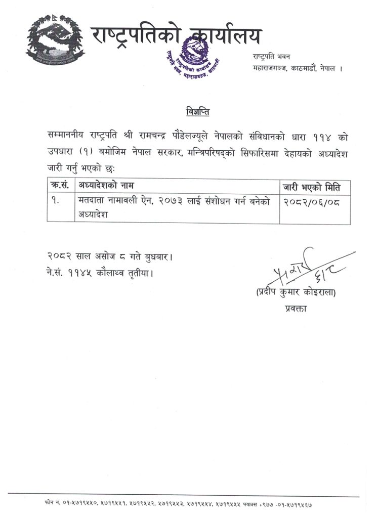 संविधानको धारा ११४ को उपधारा (१) बमोजिम मन्त्रिपरिषद्को सिफारिसमा राष्ट्रपति पौडेलले मतदाता नामावली ऐन, २०७३ लाई संशोधन गर्ने उद्देश्यले अध्यादेश जारी गरेका हुन् । यस अध्यादेशमार्फत आगामी निर्वाचन प्रक्रियामा मतदाता सूचीकृत गर्ने कार्यलाई सहज र अद्यावधिक बनाउन कानुनी आधार तयार भएको छ।