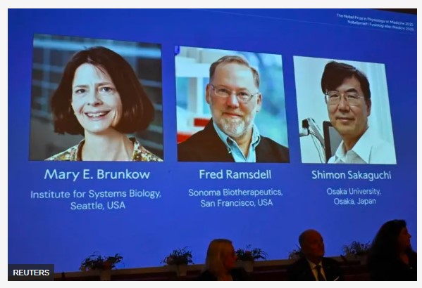 संयुक्त राज्य अमेरिकाका मेरी ब्रन्को, फ्रेड र्याम्स्डेल र जापानका शिमोन साकागुचीलाई सन् २०२५ को पुरस्कार दिने निर्णय भएको समितिले सोमवार जनाएको हो । उनीहरूलाई शरीरको प्रतिरोध प्रणालीमा ‘रेग्यलेटरी टी–सेल’ भनिने विशेष कोषहरू रक्षकका रूपमा उपस्थित हुने तथ्य पत्ता लगाउन गरेको विशेष योगदानका लागि पुरस्कृत गरिएको हो ।