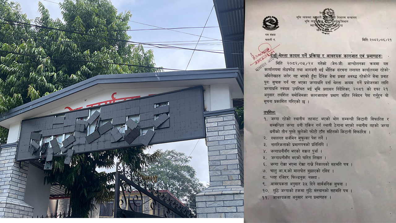 गत भदौ २४ गतेको आन्दोलनका क्रममा कार्यालय भवनमा भीषण आगलागी हुँदा अधिकांश भौतिक संरचना र अभिलेख नष्ट भएका थिए। तर केही क्षेत्रमा रहेको मूल स्रेस्ता (भूमि अभिलेख) सुरक्षित रहनु “सकारात्मक समाचार” भएको कार्यालयले उल्लेख गरेको छ।