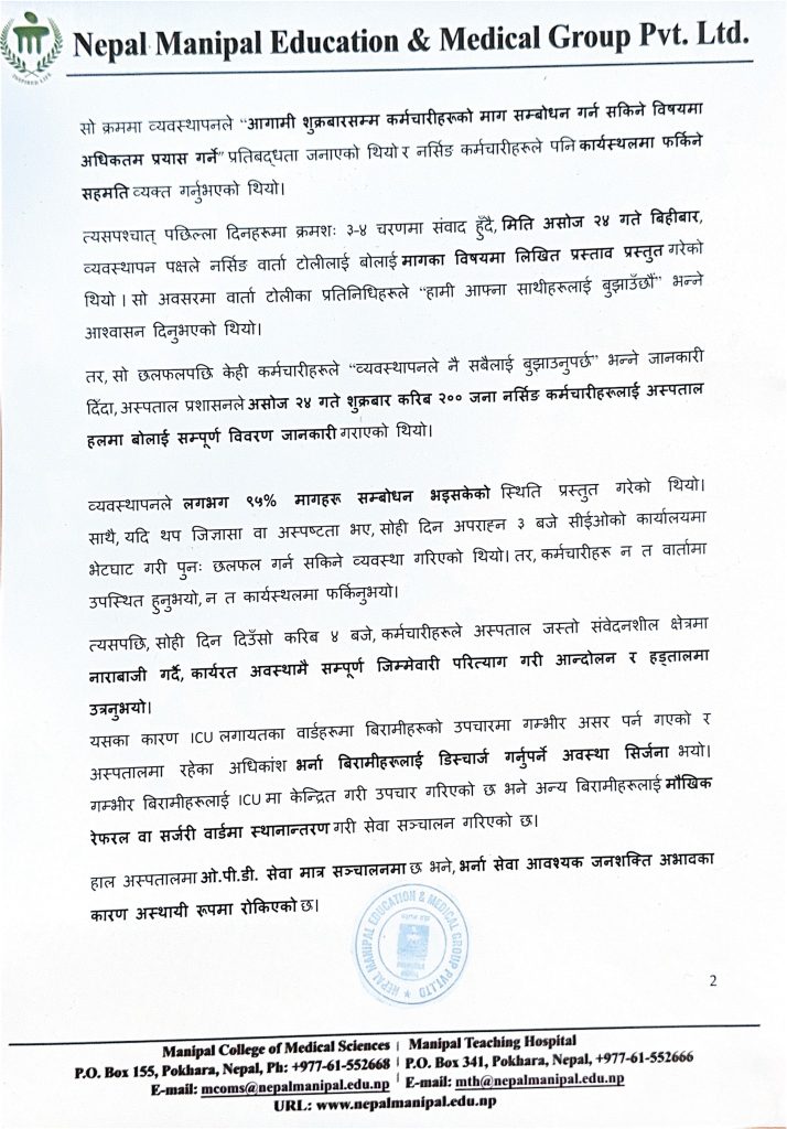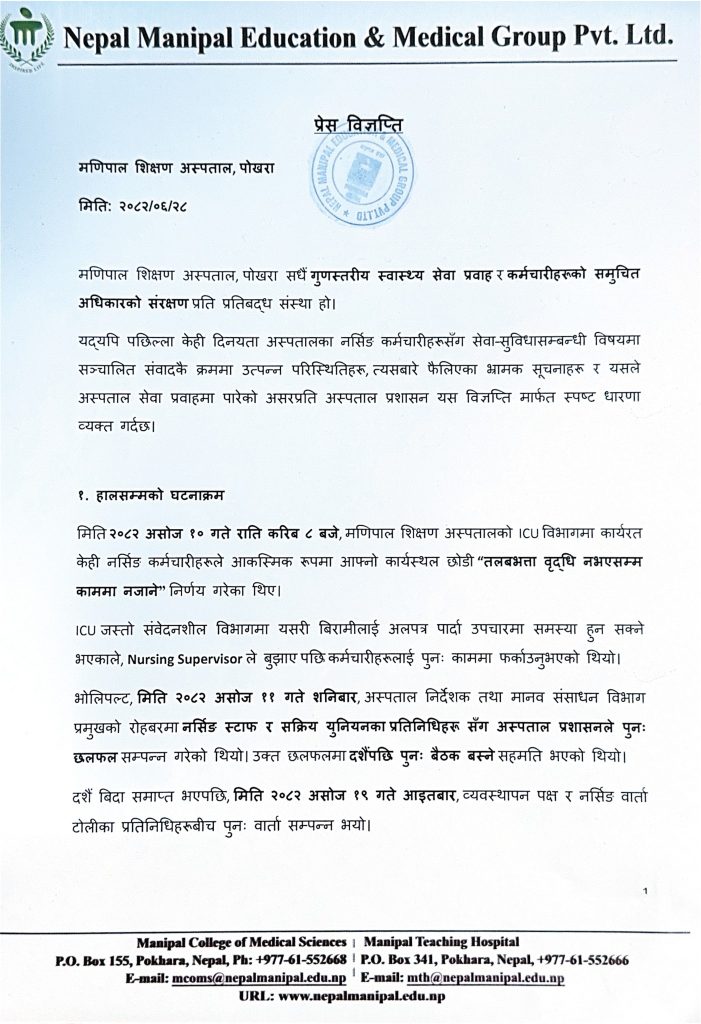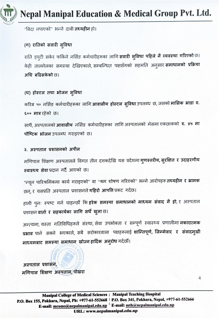 मणिपाल शिक्षण अस्पताल विगत दशकदेखि यस प्रदेशमा गुणस्तरीय, सुरक्षित र उदाहरणीय स्वास्थ्य सेवा प्रदान गर्दै आएको छ। ‘न्यून पारिश्रमिकमा काम गराइयो’ वा ‘श्रम शोषण गरियो’ भन्ने आरोप तथ्यहीन र भ्रामक रहेको तथा अस्पताल प्रशासनले गहिरो आपत्ति प्रकट गरेको छ। अस्पताल प्रशासनले पुनः स्पष्ट गर्न चाहेको छ कि हरेक समस्या समाधानको माध्यम संवाद नै हो। यस्ता गतिविधिहरुले संस्था, सेवा उपभोक्ता र सम्पूर्ण स्वास्थ्य प्रणालीमा नकारात्मक प्रभाव पार्ने सक्ने भएकाले सबै सरोकारवालालाई शान्तिपूर्ण, जिम्मेवार र संवादमुखी माध्यमबाट समस्या समाधान खोज्न हार्दिक अनुरोध गरेको छ।