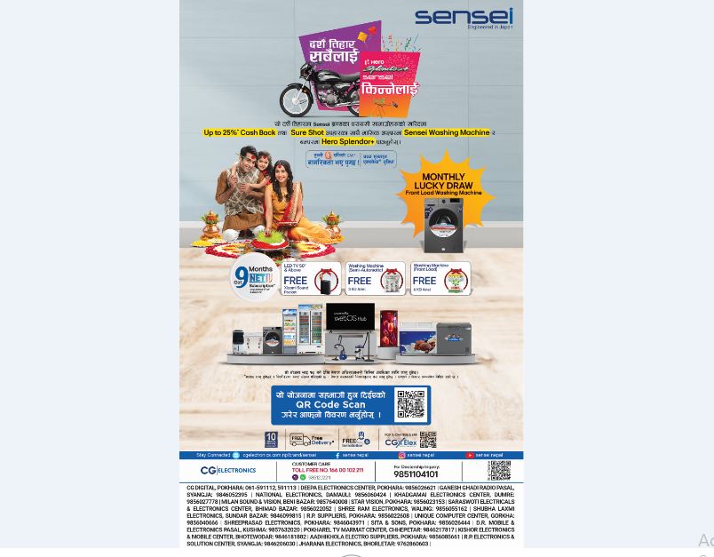 जापानी प्रविधिमा आधारित घरेलु उपकरण ब्रान्ड सेन्साइले यसपालिको दसैं, तिहार र छठ पर्वलाई लक्ष्य गर्दै उपभोक्ताहरूका लागि विशेष उपहार योजना ल्याएको छ । यस अफरअन्तर्गत ग्राहकहरूले सेन्साइको कुनै पनि घरायसी सामान खरिदमा २५ प्रतिशतसम्म क्यास ब्याक, पक्का उपहारका साथै मासिक उपहारमा सेन्साइका वासिङ मेसिन र बम्पर उपहारमा हिरो स्प्लेन्डर मोटरसाइकल जित्ने सुवर्ण अवसर पाउनेछन् ।