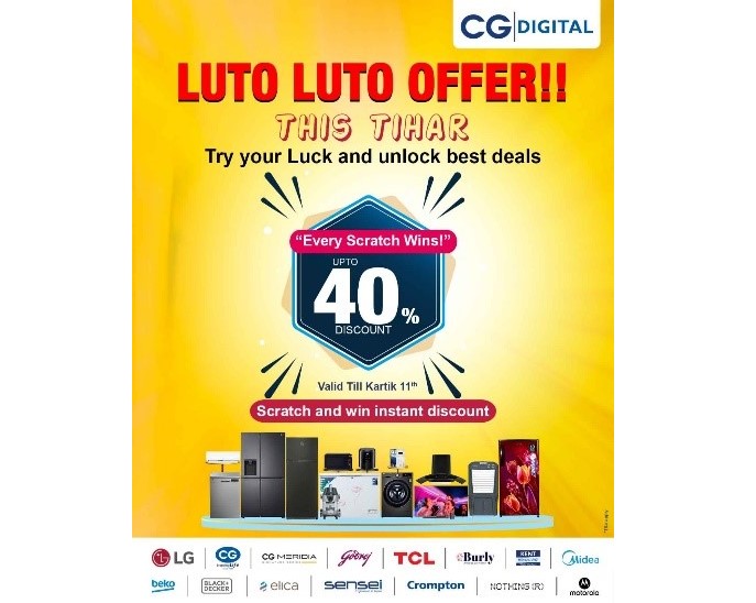 आसन्न तिहार पर्वलाई लक्ष्य गर्दै सिजी डिजिटल र एलजी शपले ‘लुटो लुटो अफर !! स्क्र्याच एन्ड विन इन्स्ट्यान्ट डिस्काउन्ट’ नामक विशेष ग्राहक अभियान सुरु गरेका छन् ।