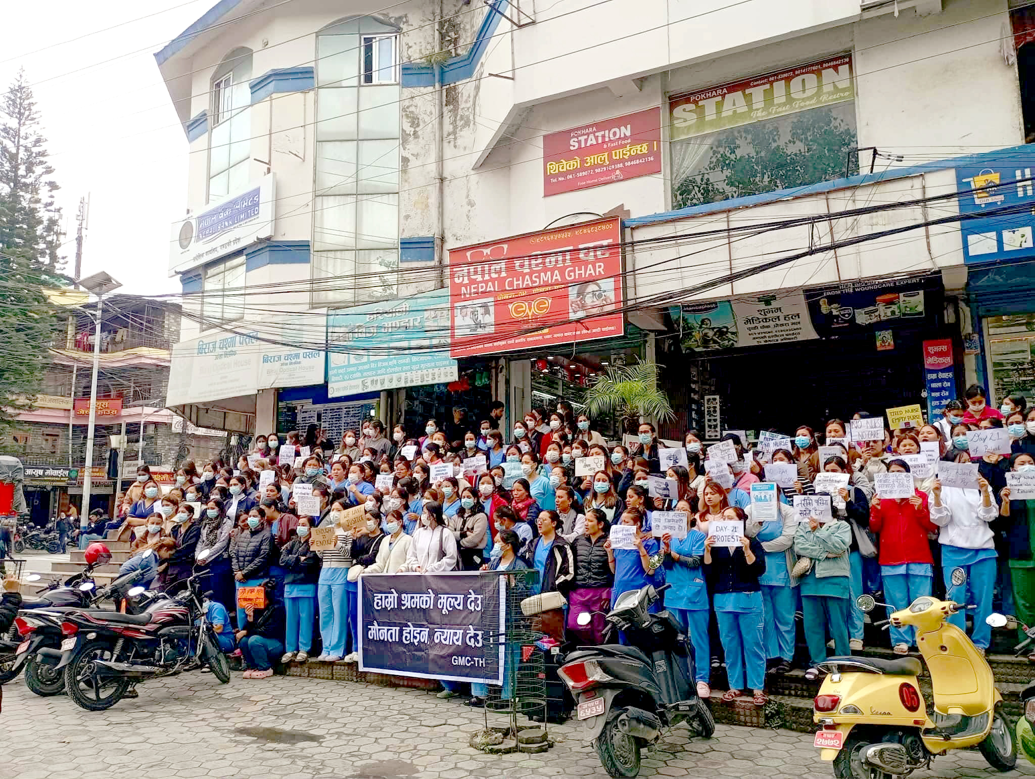 नेपाल नर्सिङ संघको अगुवाइमा देशभरका स्वास्थ्य शिक्षण संस्था, निजी, सामुदायिक, सरकारी तथा गैरसरकारी अस्पतालका नर्स एवम् अन्य स्वास्थ्यकर्मी कार्यरत संस्थासँग न्यूनतम सेवा सुविधा लगायतको १५ बुँदे माग राख्दै आन्दोलनमा उत्रिएका थिए ।