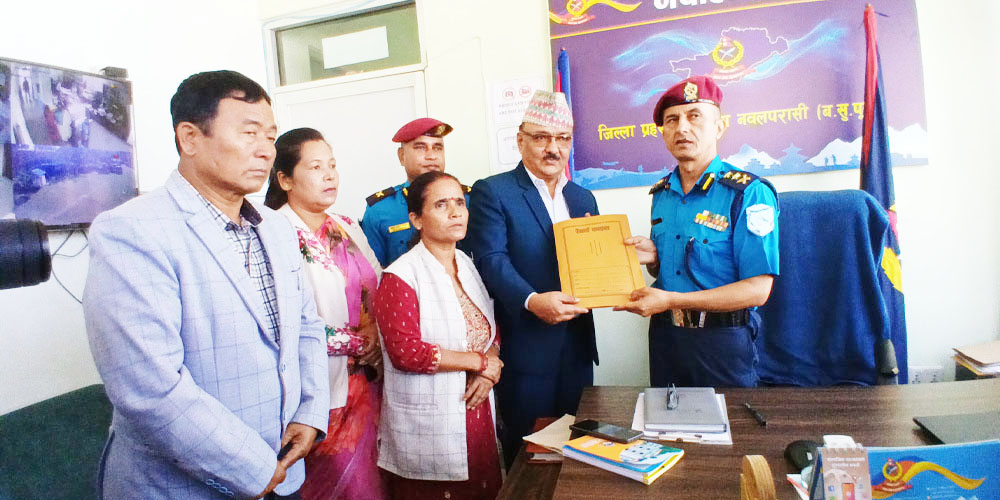 भदौ २३ र २४ गते भएको जेनजी आन्दोलनका क्रममा आगजनी, तोडफोड र लुटपाटमा संलग्न व्यक्तिहरूलाई कारबाहीको माग गर्दै नवलपुरका जनप्रतिनिधिहरूले बुधबार किटानी जाहेरी दिएका छन् । मध्यविन्दु नगर प्रमुख भीमलाल अधिकारीको नेतृत्वमा जिल्ला प्रहरी कार्यालयमा पुगेको जनप्रतिनिधिहरूको टोलीले प्रहरी प्रमुख युवराज खड्कासमक्ष जाहेरी बुझाएको हो ।