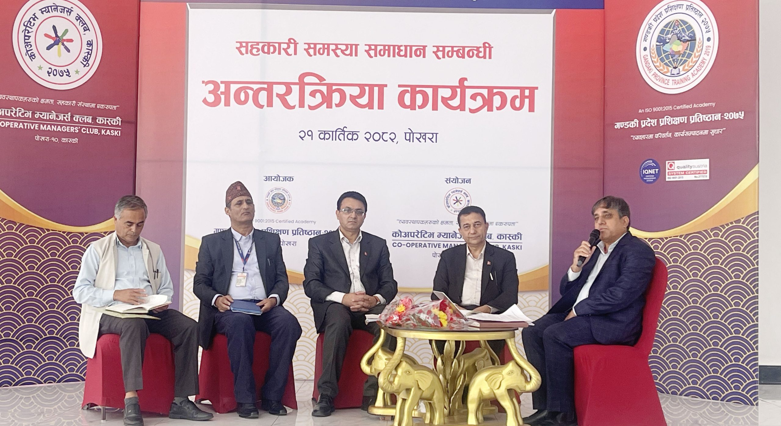 पोखरा। सहकारी समस्या समाधानसम्बन्धी अन्तरक्रिया कार्यक्रम पोखरामा शुक्रबार भएको छ । गण्डकी प्रदेश प्रशिक्षण प्रतिष्ठान र कोअपरेटिभ म्यानेजर्स क्लब कास्कीको संयोजनमा कार्यक्रम भएको हो । कार्यक्रममा सहभागीहरुले नियमनकारी निकाय र सहकारी सदस्यहरुकै बेवास्ताका कारण सहकारीमा समस्या बढेको बनाए । कार्यक्रममा सहकारी रजिस्ट्रारको कार्यालय, गण्डकीका रजिस्ट्रार भेषराज रिजालले गण्डकी प्रदेशका विभिन्न सहकारीबाट ५ अर्ब ६३ करोड ४१ लाख ३९ हजार ९६२ रुपैयाँ हिनामिना भएको बताए ।