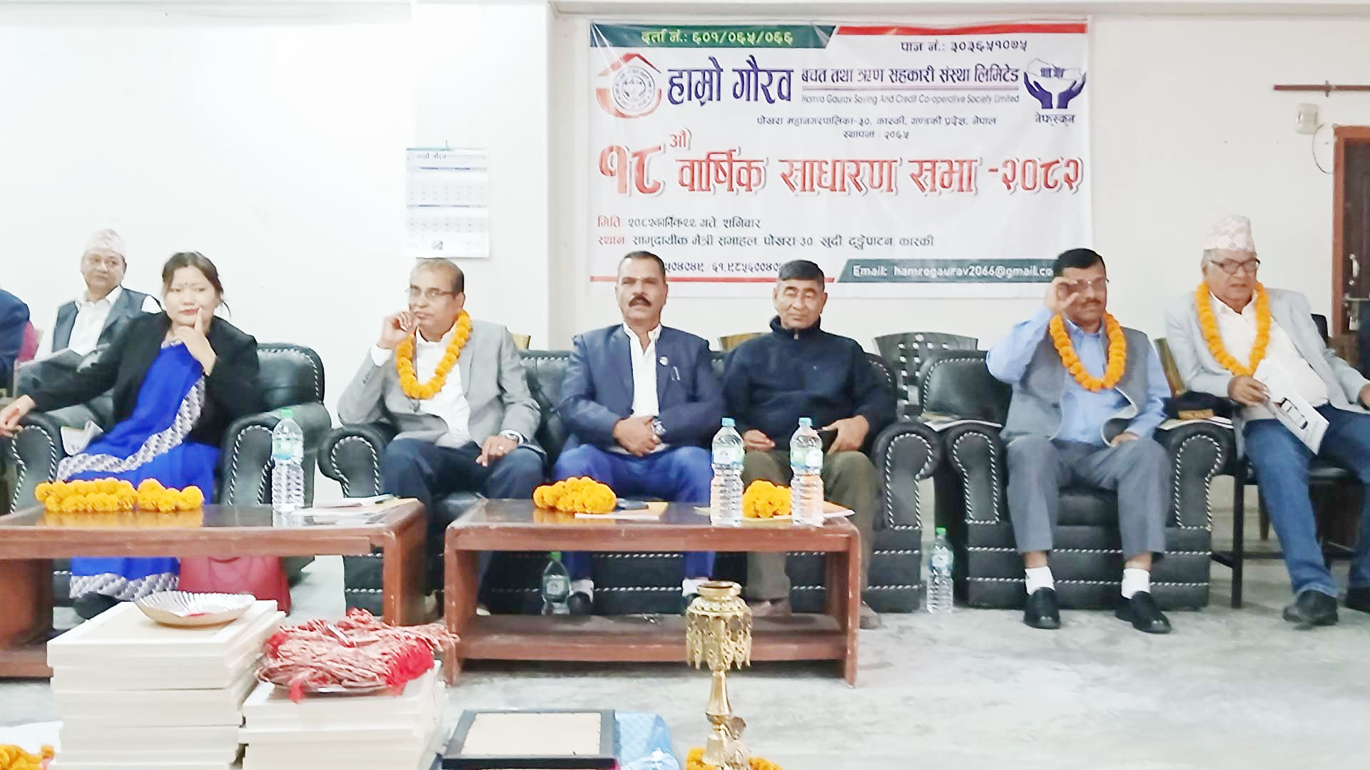 हाम्रो गौरव बचत तथा ऋण सहकारी संस्थाको १८ औं साधारणसभा शनिबार भएको छ । सभामा पोखरा महानगरपालिका वडा नं. ३० का वडाध्यक्ष दुर्गाप्रसाद सुवेदीले सर्वमान्य सिद्धान्त, मूल्य र मान्यता अनुसार सहकारीलाई अगाडि बढाउन कसैको दबाब र प्रभावमा नपरी काम गर्न सुझाव दिए ।