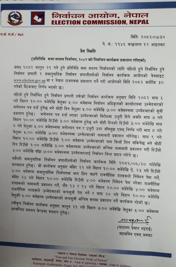 प्रतिनिधि सभा निर्वाचनका लागि आयोगद्वारा कार्यतालिका सार्वजनिक, माघ ६ गते उम्मेदवारी दर्ता