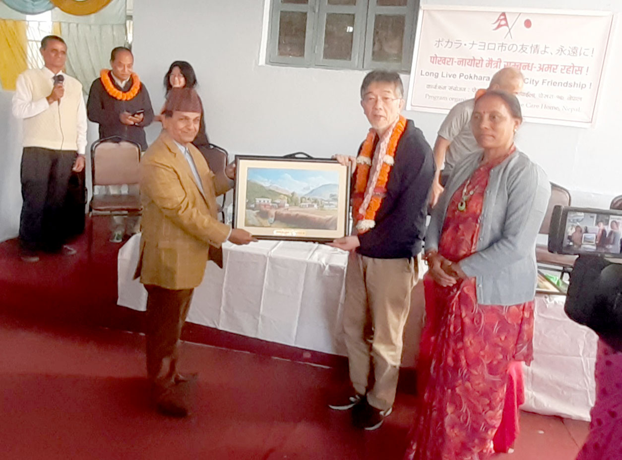 पोखरा । जापानको नायोरो नगरका उपप्रमुख सहितको प्रतिनिधि मण्डललाई शुक्रबार पोखरा वृद्धाश्रममा स्वागत गरिएको छ । नायोरो नगरका उपप्रमुख मासामिचि हासिमोतो, नायोरोका समाज कल्याण शाखा प्रबन्ध निर्देशक युटो गोटो सहितको प्रतिनिधि मण्डललाई पोखरा वृद्धाश्रमका अध्यक्ष कुसुमकेशव पराजुली लगायतले स्वागत गरेका हुन् ।