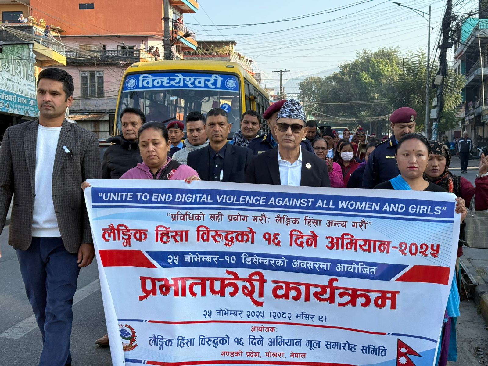 लैंगिक हिंसा विरुद्धको १६ दिने अभियान २०२५ अन्तर्गत आयोजित प्रभातफेरी कार्यक्रममा गण्डकी प्रदेशका सामाजिक विकास, युवा तथा खेलकुद मन्त्री विन्दुकुमार थापाले महिलामाथि हुने सबै प्रकारका हिंसा अन्त्यका लागि राज्यदेखि समाजसम्मको सामूहिक प्रतिबद्धता आवश्यक भएको बताएका छन्।