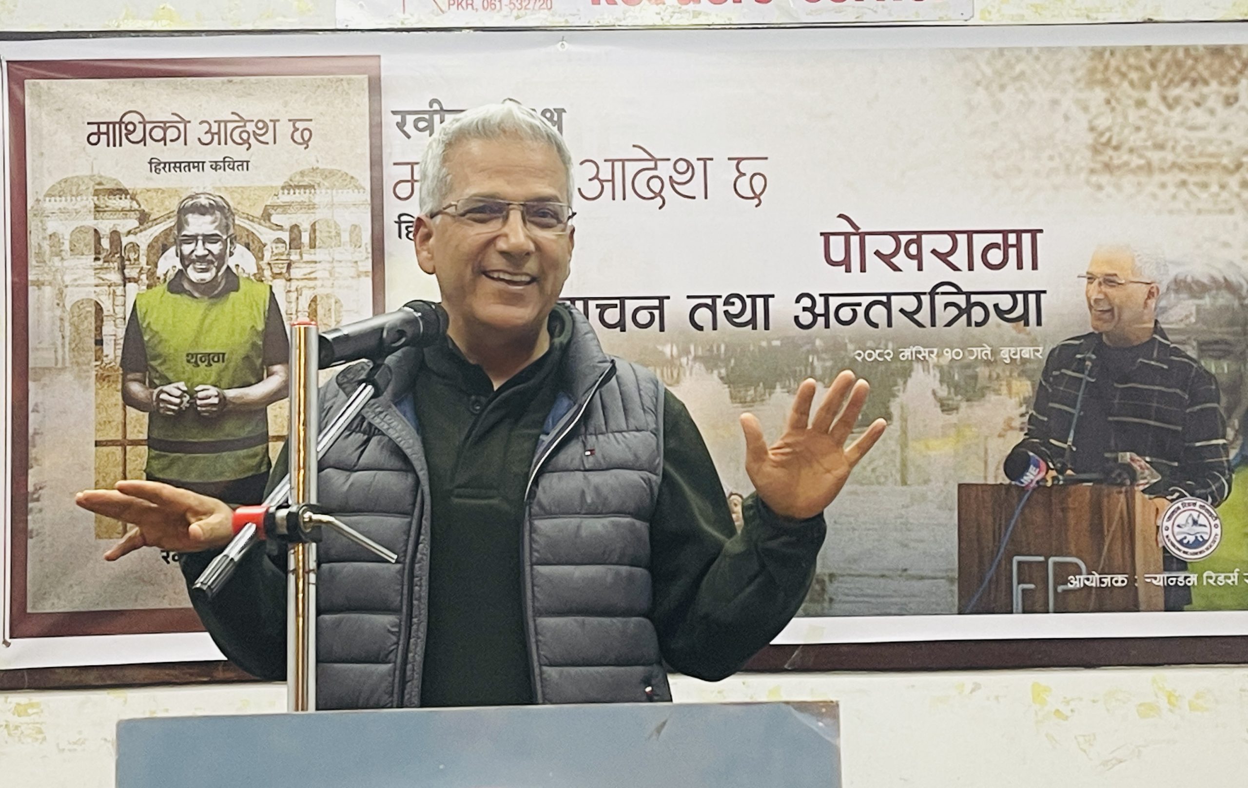 राष्ट्रिय प्रजातन्त्र पार्टीका वरिष्ठ उपाध्यक्ष रवीन्द्र मिश्रले लेखेको कविता संग्रह ‘माथिको आदेश छ’ मा लेखिएका कविताले उनले जेल जीवन बिताउँदा पाएको सास्ती बोलेको छ । र्यान्डम रिडर्स सोसाइटीले बुधबार पोखरामा आयोजना गरेको ‘रविन्द्र मिश्र माथिको आदेश छ हिरासतमा कविता पोखरामा वाचन तथा अन्तरक्रिया’ कार्यक्रममा मिश्रले उक्त संग्रहमा रहेका कविता सुनाउँदै कुन्ठा पोखे ।