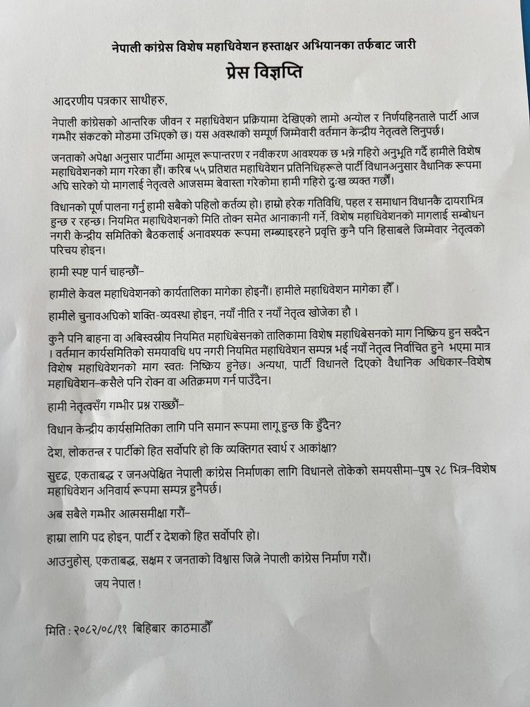 विशेष महाधिवेशनको माग नेतृत्वले बेवास्ता गरेको विशेष महाधिवेशन हस्ताक्षर अभियानको गुनासो