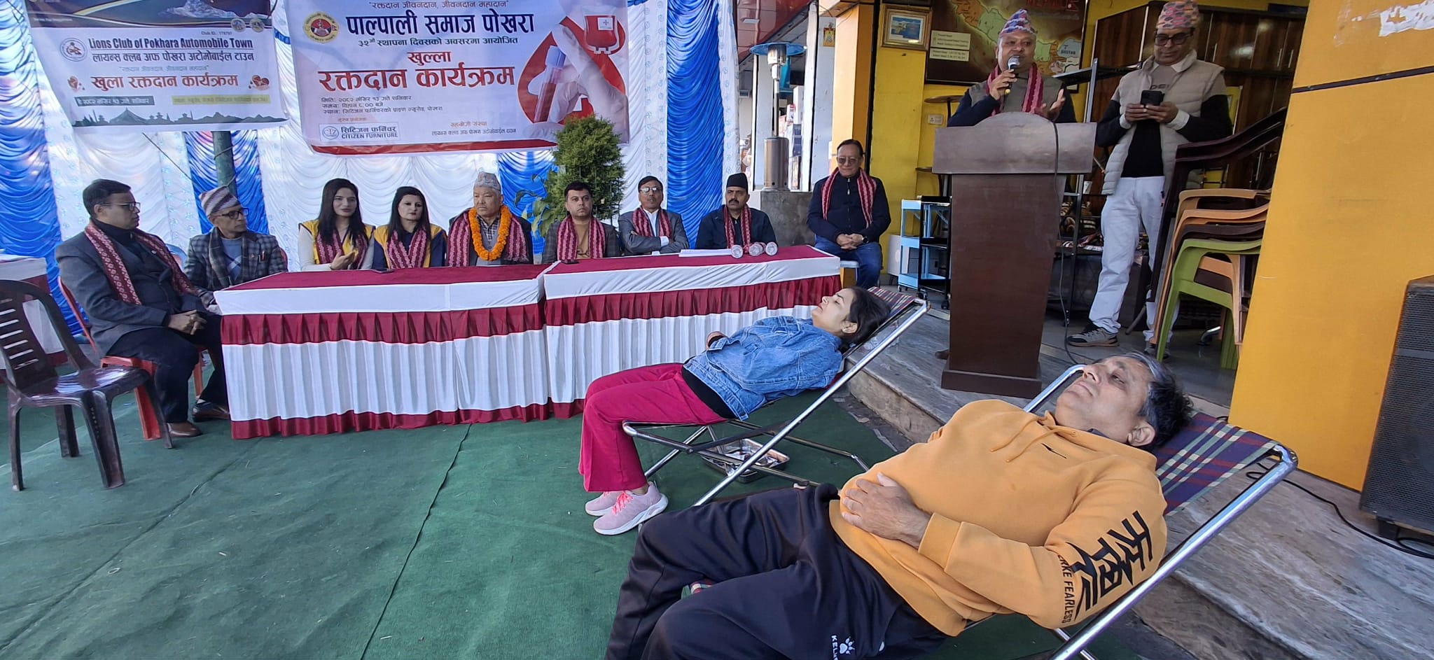 पोखरा । पाल्पाली समाज पोखरा ९ ले शनिबार खुला रक्तदान आयोजना गरेको छ । ३२ स्थापना दिवसको सन्दर्भमा लायन्स क्लब पोखरा अटोमोबाइल टाउनसँगको सहकार्य भएको कार्यक्रममा ६३ युनिट रगत संकलन भएको समाजका अध्यक्ष श्रीधर पराजुलीले जानकारी दिए ।