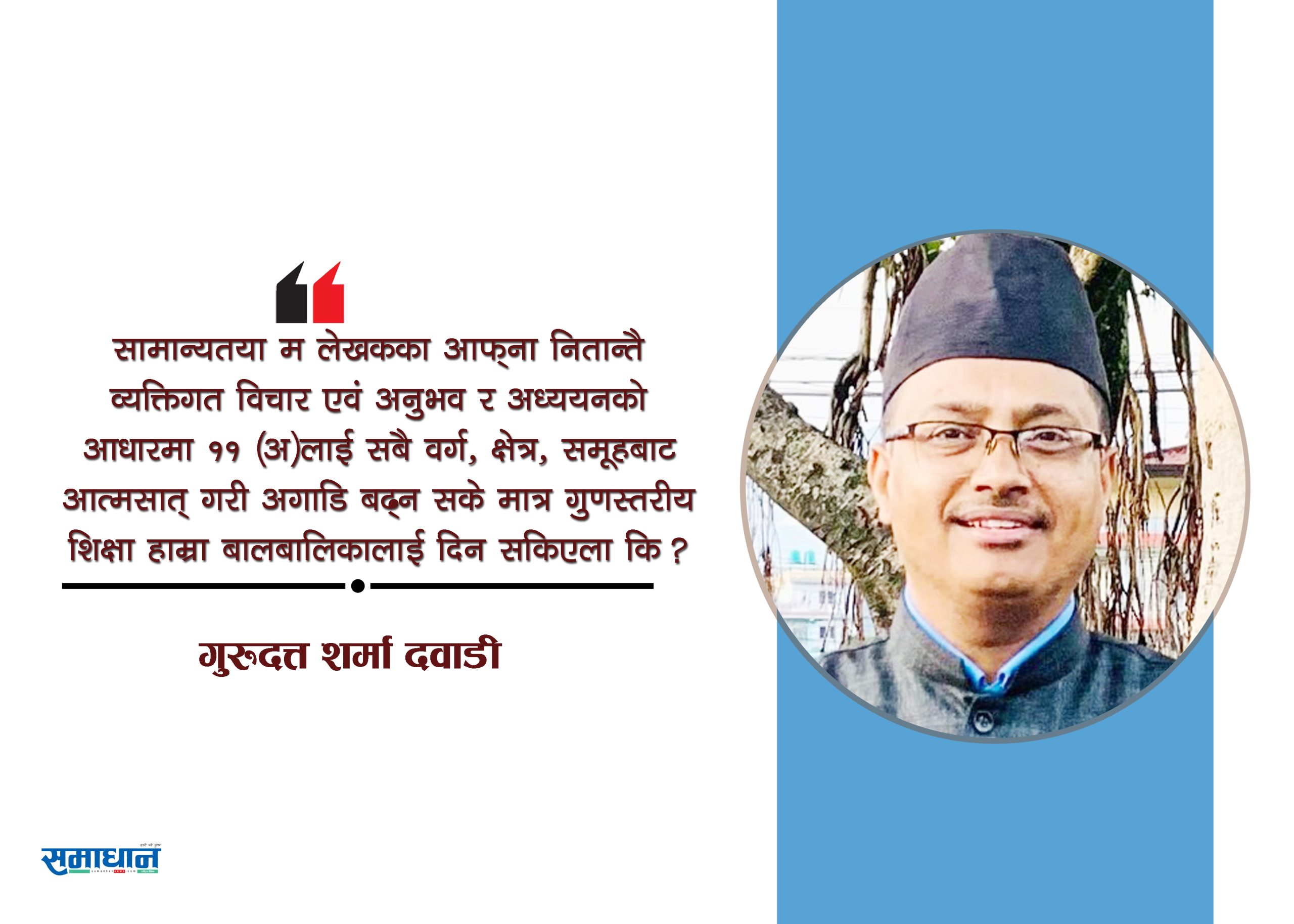 सामान्यतया म लेखकका आफ्ना नितान्तै व्यक्तिगत विचार एवं अनुभव र अध्ययनको आधारमा ११ ‘अ’लाई सबै वर्ग, क्षेत्र, समूहबाट आत्मसात् गरी अगाडि बढ्न सके मात्र गुणस्तरीय शिक्षा हाम्रा बालबालिकालाई दिन सकिएला कि?