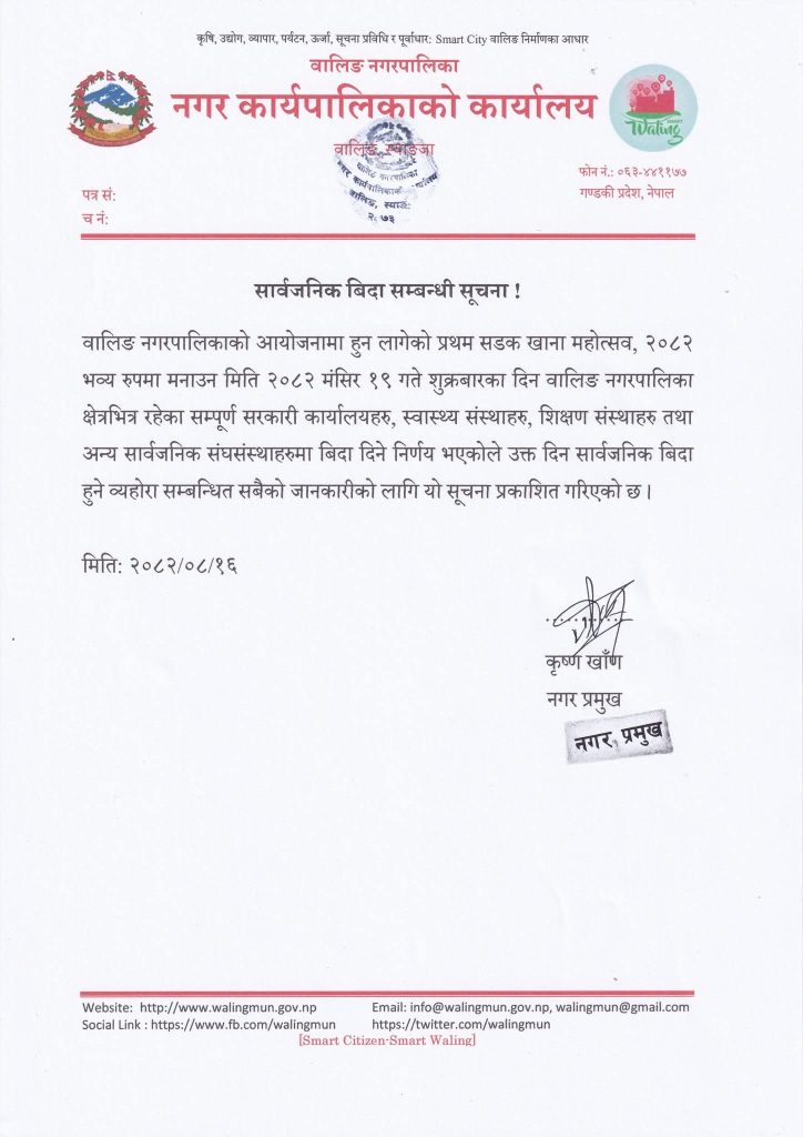 वालिङ । स्याङ्जाको वालिङ नगरपालिकाले ‘प्रथम सडक खाना महोत्सव २०८२’ को अवसरमा नगर क्षेत्रमा सार्वजनिक बिदा दिने निर्णय गरेको छ । नगरपालिकाले मङ्सिर १९ गते शुक्रबार आयोजना हुन लागेको महोत्सवलाई भव्य रूपमा मनाउन सार्वजनिक बिदा दिएको हो ।