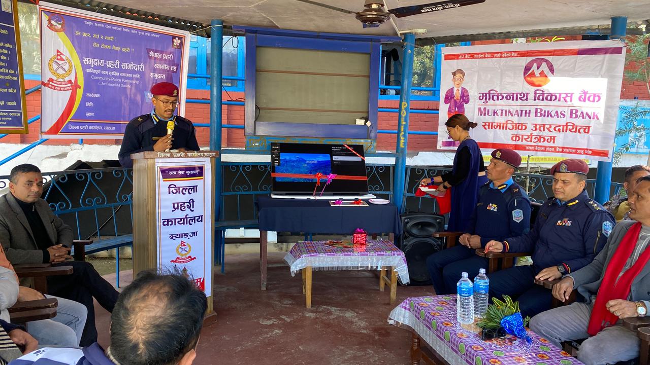 स्याङ्जा । ‘समुदाय–प्रहरी साझेदारी कार्यक्रम’ अन्तर्गत जनचेतनामूलक सन्देश प्रवाह गर्न मुक्तिनाथ विकास बैंक स्याङ्जा शाखाले जिल्ला प्रहरी कार्यालय स्याङ्जालाई स्मार्ट टेलिभिजनलगायतका सामग्री हस्तान्तरण गरेको छ । शुक्रबार एक कार्यक्रमबीच बैंकले प्रहरीलाई सो सामग्री सहयोगस्वरूप प्रदान गरेको हो ।
