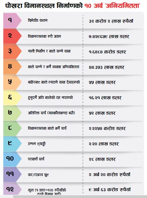 अख्तियारले आइतबार अदालतमा दर्ता गराएको आरोपपत्र अनुसार लागत अनुमानमा अस्वाभाविक वृद्धि देखाइएको छ । पोखरा विमानस्थलका लागि जाइकाले सन् १९८९ मा गरेको अध्ययन र पछि नागरिक उड्डयन प्राधिकरणले तयार पारेको लागत अनुमान करिब १४५ मिलियन डलर (पछि मुद्रास्फीति जोड्दा १६६.४१ मिलियन डलर) थियो । तर, ठेकेदार कम्पनी चिनियाँ सीएएमसी इन्जिनियरिङले २८७ मिलियन डलर प्रस्ताव गरेको अख्तियारको भनाइ छ । मिलेमतोमा लागत इस्टिमेट नै अस्वाभाविक रुपमा बढाइएको अख्तियारको जिकिर छ ।