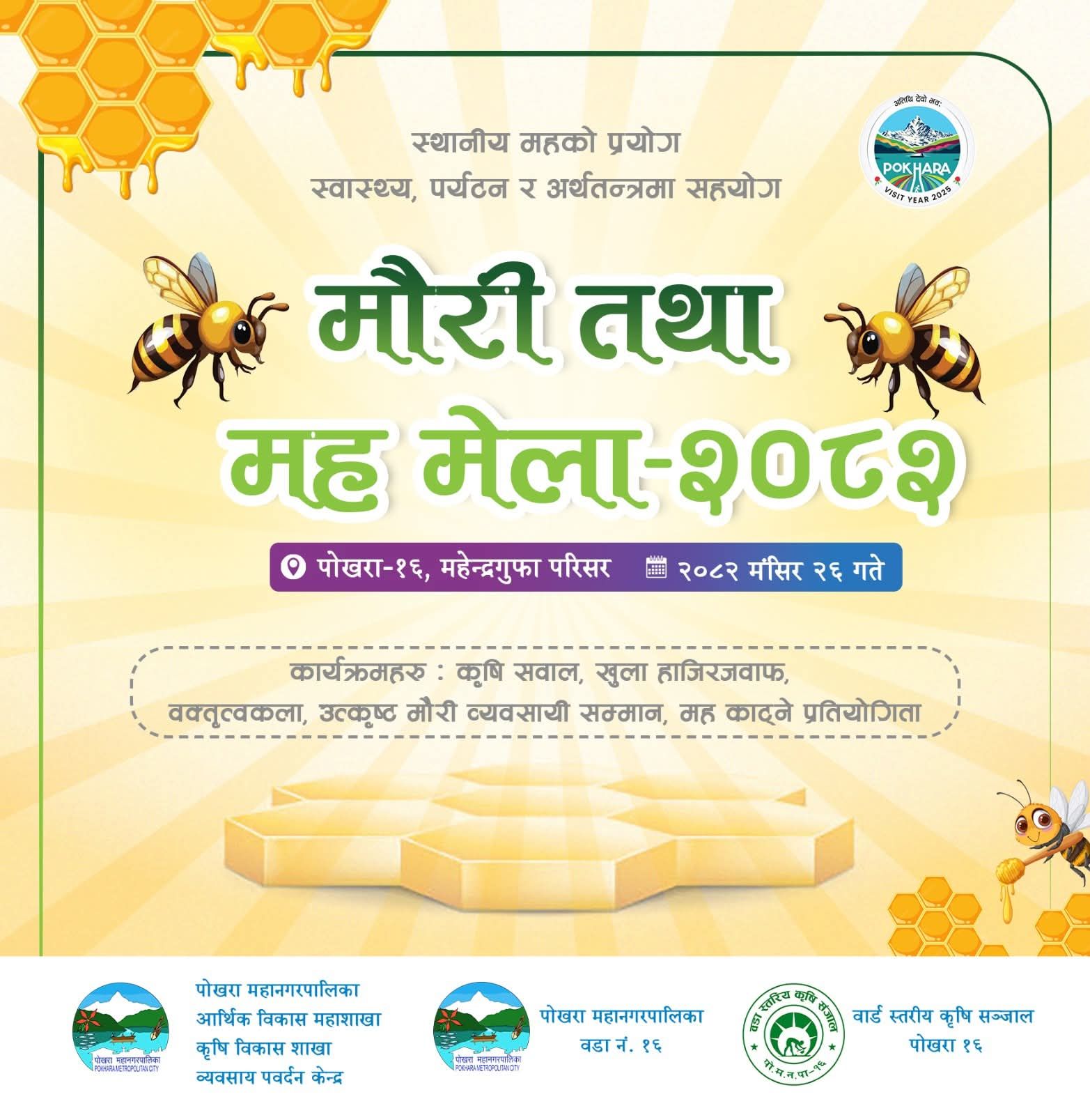 पोखरा महानगरपालिकाको आर्थिक विकास महाशाखा, पोखरा महानगरपालिका वडा नम्बर १६ र वडास्तरीय कृषि सञ्जाल पोखरा १६ को आयोजनामा मौरीपालनलाई प्रवर्धन गर्दै पर्यटनलाई सघाउन महोत्सव गर्न लार्गिको हो ।