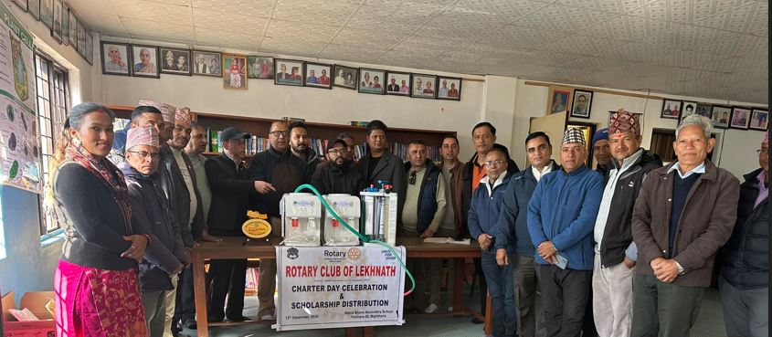 पोखरा । रोटरी क्लब अफ लेखनाथले आफ्नो स्थापना दिवसको अवसरमा पोखरा–२८ माझठानास्थित रत्नशोभा माध्यमिक विद्यालयलाई शुद्ध खानेपानीका उपकरण सहयोग गरेको छ । रोटरी इन्टरनेसनल डिस्ट्रिक्ट ३२९२ अन्तर्गतको उक्त क्लबले विद्यालयलाई १ थान वाटर प्युरिफायर र २ थान तातो–चिसो पानी आउने वाटर डिस्पेन्सर हस्तान्तरण गरेको हो ।