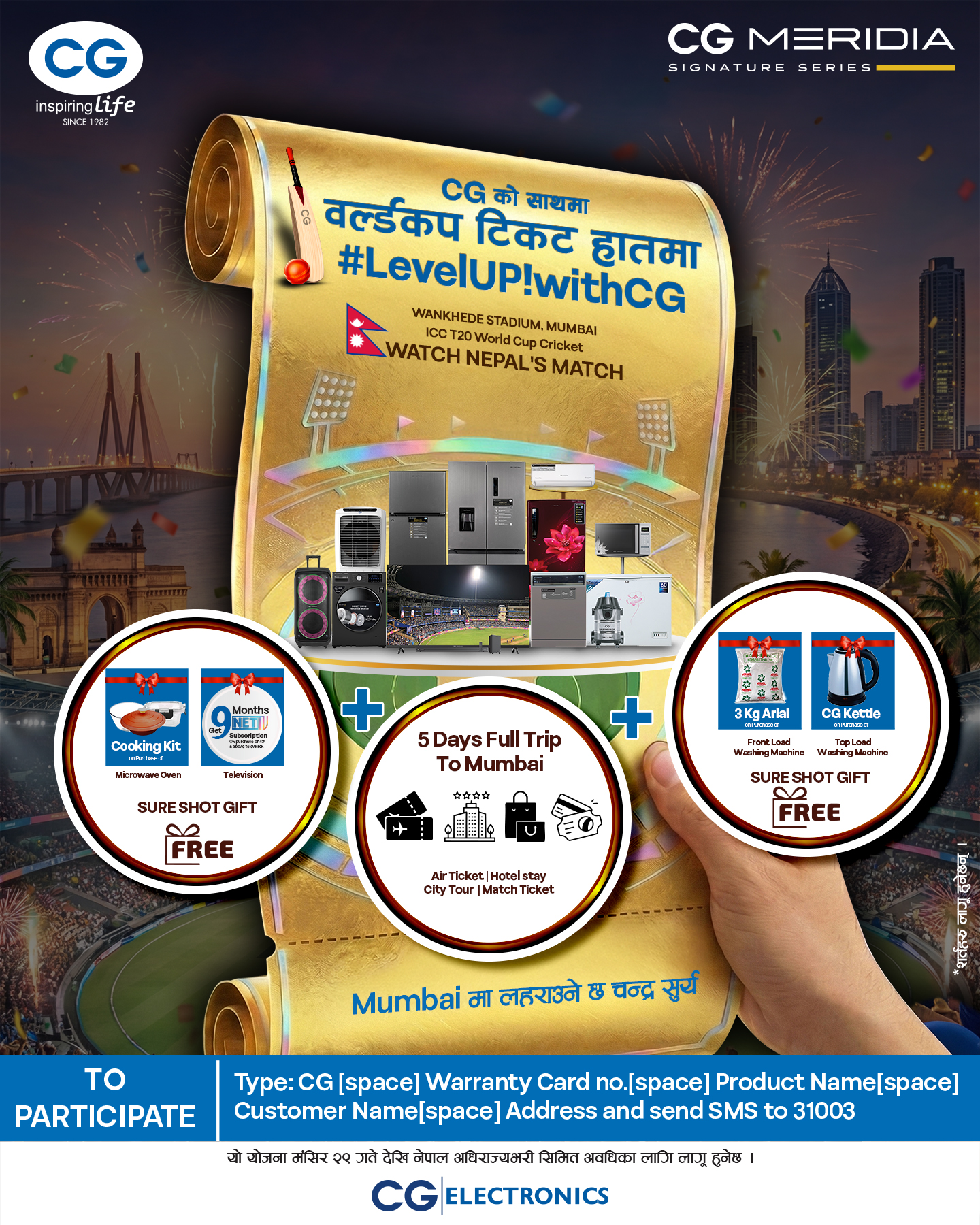 आगामी आईसीसी टी–२० वर्ल्डकपको उत्साहलाई मध्यनजर गर्दै ल्याइएको यस योजनाअन्तर्गत ग्राहकहरूले सिजी ब्रान्डका सामान खरिदमा हातखाली नजाने पक्का उपहार र बम्पर उपहारमा मुम्बईको विलासी भ्रमण जित्ने अवसर पाउने छन् । कम्पनीका अनुसार बम्पर उपहारका विजेताले आईसीसी टी–२० वर्ल्डकपअन्तर्गत मुम्बईको पूर्ण भ्रमण प्याकेज प्राप्त गर्ने छन् । यो योजनामा सहभागी हुन ग्राहकले मोबाइलको म्यासेज बक्समा गई सिजी (स्पेस) वारेन्टी कार्ड नम्बर (स्पेस) प्रोडक्टको नाम (स्पेस) ग्राहकको नाम (स्पेस) ठेगाना टाइप गरेर ३१००३ मा एसएमएस पठाउनुपर्ने छ । यसरी प्राप्त म्यासेजहरूमध्येबाट लक्की ड्रमार्फत विजेता छनोट गरिने कम्पनीले जनाएको छ ।