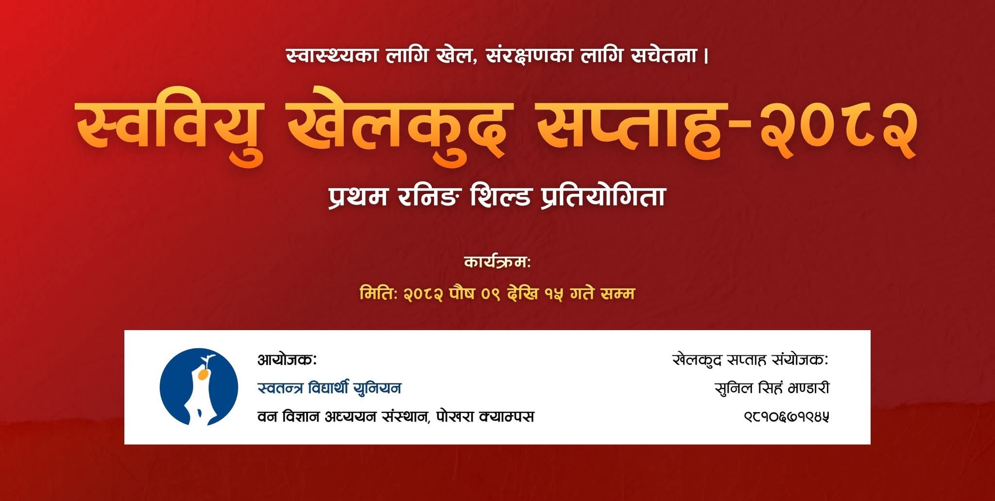 वन विज्ञान अध्ययन संस्थान पोखरा क्याम्पसमा स्वतन्त्र विद्यार्थी युनियन (स्ववियु) को आयोजनामा ‘स्ववियु खेलकुद सप्ताह–२०८२’ आगामी पौष ९ गतेदेखि १५ गतेसम्म सञ्चालन हुने भएको छ।