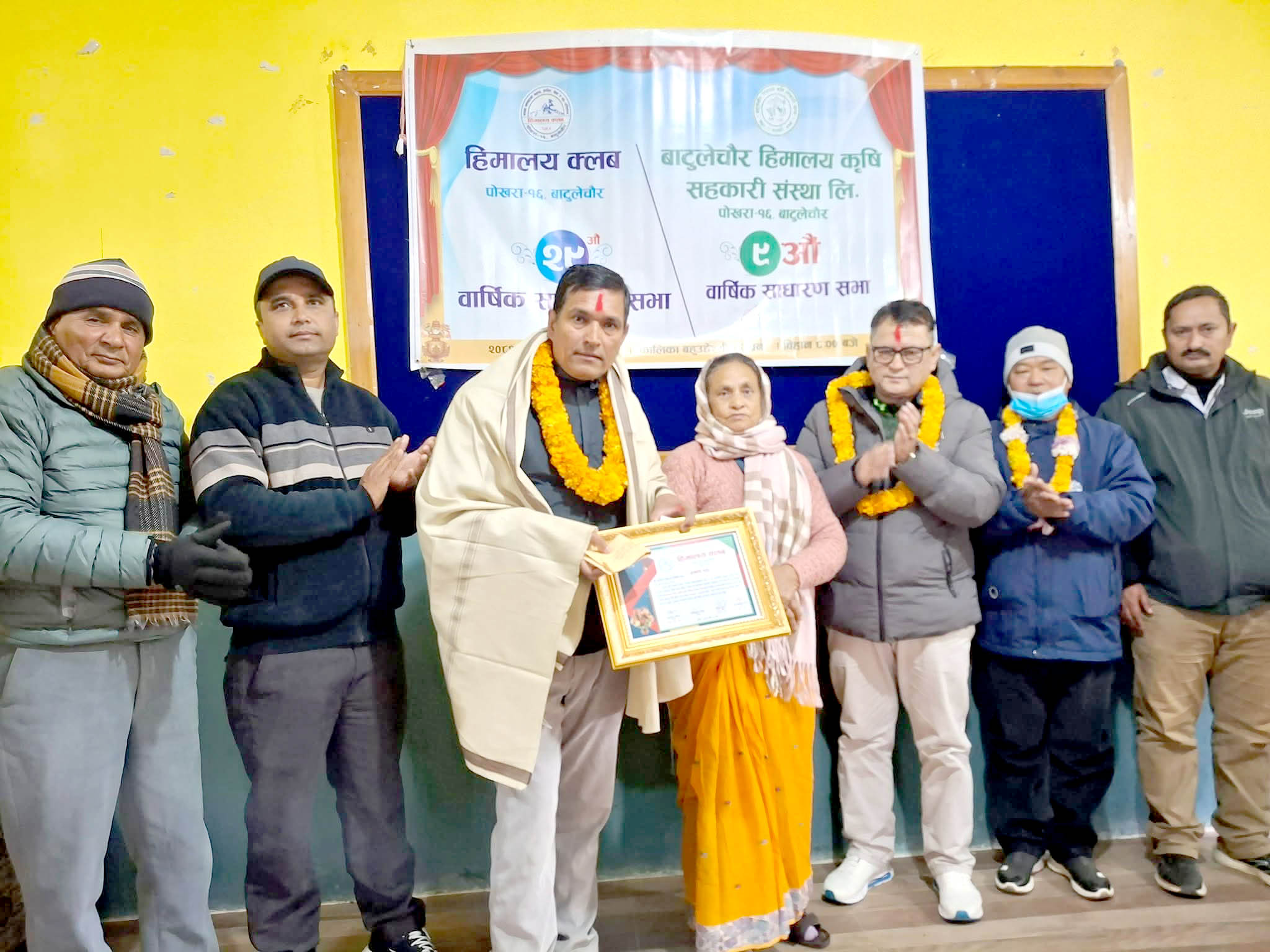 क्लबको २९ औं बार्षिक साधारण सभामा उनलाई संस्थापक अध्यक्ष तीर्थमान तामाङ, मानार्थ सदस्य कुमार खड्का, पोखरा १६ का वडाध्यक्ष अमृत शर्मा तिमिल्सिना, पूर्ववडाध्यक्ष जीवनप्रसाद आचार्य, क्लबका मानार्थ सदस्य वेनीबहादुर बस्नेत, उदयबहादुर बस्नेतकी पत्नी गणेशकुमारी बस्नेत र क्लबका पूर्वअध्यक्ष जीवनारायण श्रेष्ठले नगद १० हजार र सम्मानपसहित सम्मान गरे ।