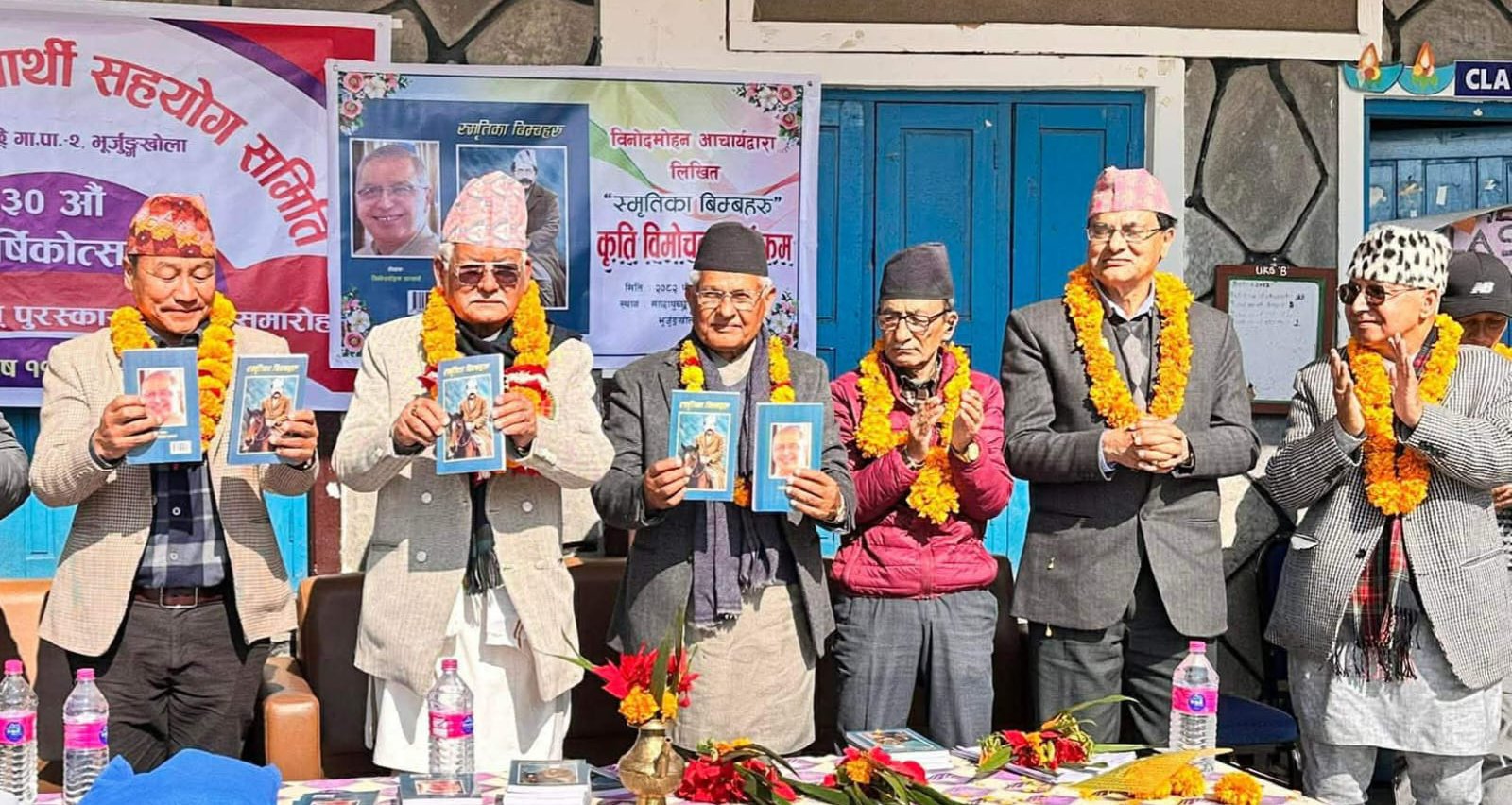पूर्व उच्च अदालतका न्यायाधीश एवं लेखक विनोदमोहन आचार्यको कृति ‘स्मृतिका विम्बहरू’ शुक्रबार विमोचन गरिएको छ । कास्कीको माछापुच्छ्रे गाउँपालिकास्थित माछापुच्छ्रे माध्यमिक विद्यालयको प्रांगणमा आयोजित समारोहमा संस्कृतिविद् डा. जगमान गुरुङसहितका अतिथिले कृतिको संयुक्त रूपमा विमोचन गरेका हुन् ।