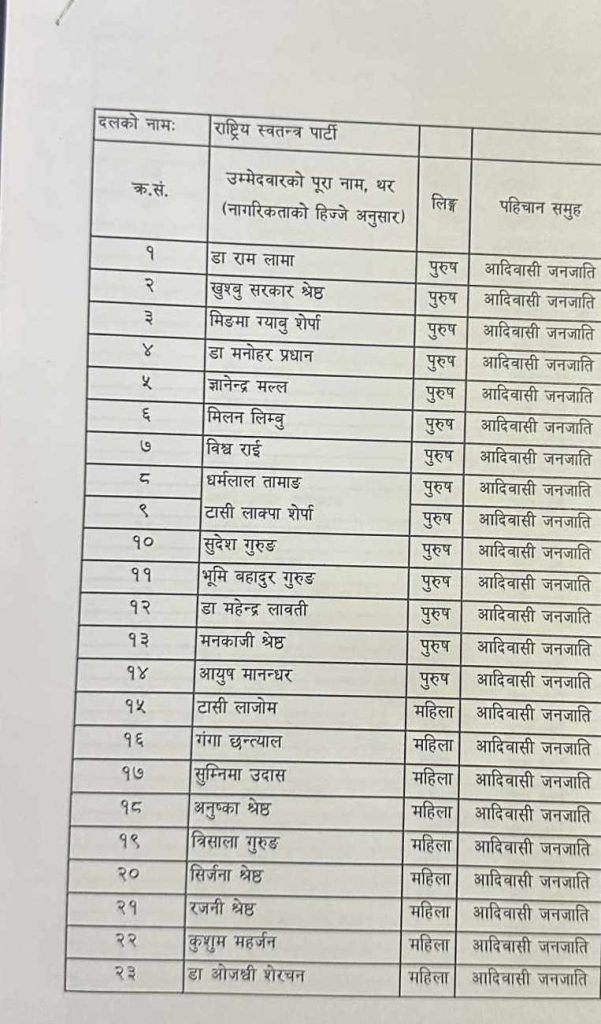 रास्वपाको समानुपातिक सूचीमा राष्ट्रिय क्रिकेट टोलीका पूर्वकप्तान ज्ञानेन्द्र मल्लदेखि चर्चित गायक प्रकाश सपूतसम्मको नाम समावेश छ। यस्तै, आसिफ शाह, अभिनेत्री रिमा विश्वकर्मा, राष्ट्रिय मानव अधिकार आयोगकी पूर्वसदस्य मोहना अन्सारी, समीक्षा बास्कोटा, रन्जु दर्शना र प्रमोद न्यौपाने पनि समानुपातिक उम्मेदवारको सूचीमा परेका छन्।