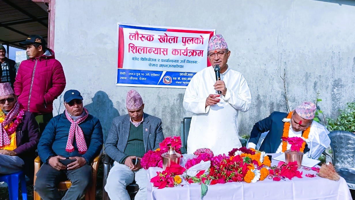 पोखरा । पोखरा महानगरपालिकाका प्रमुख धनराज आचार्यले शनिबार वडा नम्बर २४ स्थित लौरुक खोलामा मोटरेवल पुलको शिलान्यास गरेका छन्। २१.९ मिटर लम्बाइ र ८.४ मिटर चौडाइ रहने उक्त पुल निर्माणपछि महानगरका वडा नम्बर २४, २३, १८ र अन्नपूर्ण गाउँपालिकाका बासिन्दालाई बाह्रै महिना मुख्य बजारसम्म आउजाउ गर्न सहज हुनेछ। आरसीसी बक्स ब्रिज प्रकृतिको यो पुल २०८३ पुस १३ गतेभित्र निर्माण सम्पन्न गर्ने लक्ष्य राखिएको छ।