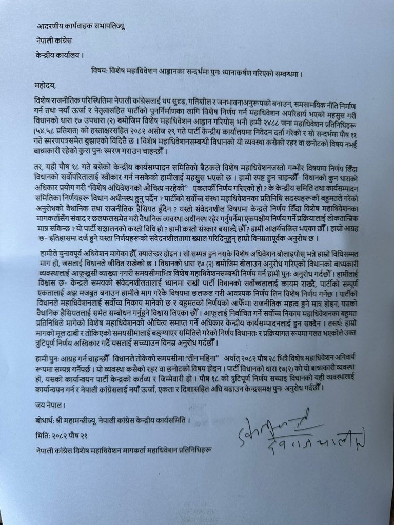 कार्यवाहक सभापतिले पत्र नबुझेपछि नेता देवराज चालिसेले पार्टी कार्यालय बाहिरै ध्यानाकर्षण पत्र पढेर सुनाएका थिए । उनले विधानको मर्यादा कायम राख्न नेतृत्व असफल भएको टिप्पणी गरे । ‘विधानको कुन धाराको अधिकार प्रयोग गरेर विशेष महाधिवेशनको औचित्य छैन भन्ने एकतर्फी निर्णय गरियो ?’ चालिसेले प्रश्न गरे । उनले आगामी पुस २८ गतेभित्रै विशेष महाधिवेशन आयोजना गर्नुपर्नेमा जोड दिँदै गत पुस १८ गते केन्द्रीय समितिले आगामी वैशाखमा महाधिवेशन गर्ने भनी गरेको निर्णय त्रुटिपूर्ण रहेको दाबी गरे ।